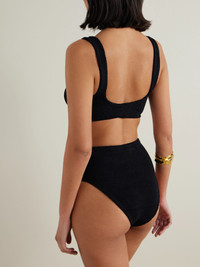 Hunza G describes its 'Judy' bikini with three words: "classic, retro, elevated". Made from signature Crinkle™ seersucker which flexes to fit most sizes, it has retro high-rise briefs and a gathered top. Size & Fit - Comfortably fits those who are between a size XSmall-XXLarge and all body shapes - Medium brief coverage - Model is 175cm/ 5'10", bra size 32B and normally wears a size Small Model measurements: - Bust: 79cm/ 31" - Waist: 64cm/ 25" - Hip: 97cm/ 38" Details & Care - Black seersucker - Slips on - 97% polyamide, 3% elastane - Hand wash - Lotion, sunscreen, oil and chlorine can cause discoloration of this item; this is not a manufacturing defect. Please follow care instructions to keep your swimwear in the best condition