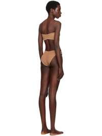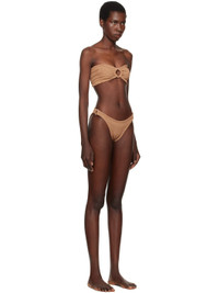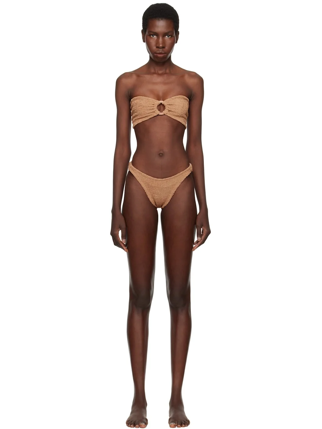 Shirred stretch nylon jersey bandeau-style bikini top. · Sweetheart neck · O-ring and gathering at chest · Unlined Shirred stretch nylon jersey bikini bottom. · Elasticized waistband · O-ring at sides · Unlined This product uses Original Crinkle™ Technology. Fits US sizes 2-12. Supplier color: Metallic cocao 97% polyamide, 3% elastane. Made in Morocco 251431F105061