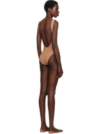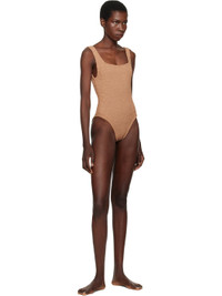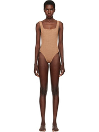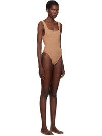 Shirred stretch nylon jersey one-piece swimsuit. · Square neck · Fixed shoulder straps · Low back · Unlined This product uses Original Crinkle™ Technology. Fits US size 2-12. Supplier color: Metallic cocao 97% polyamide, 3% elastane. Made in Morocco 251431F103055
