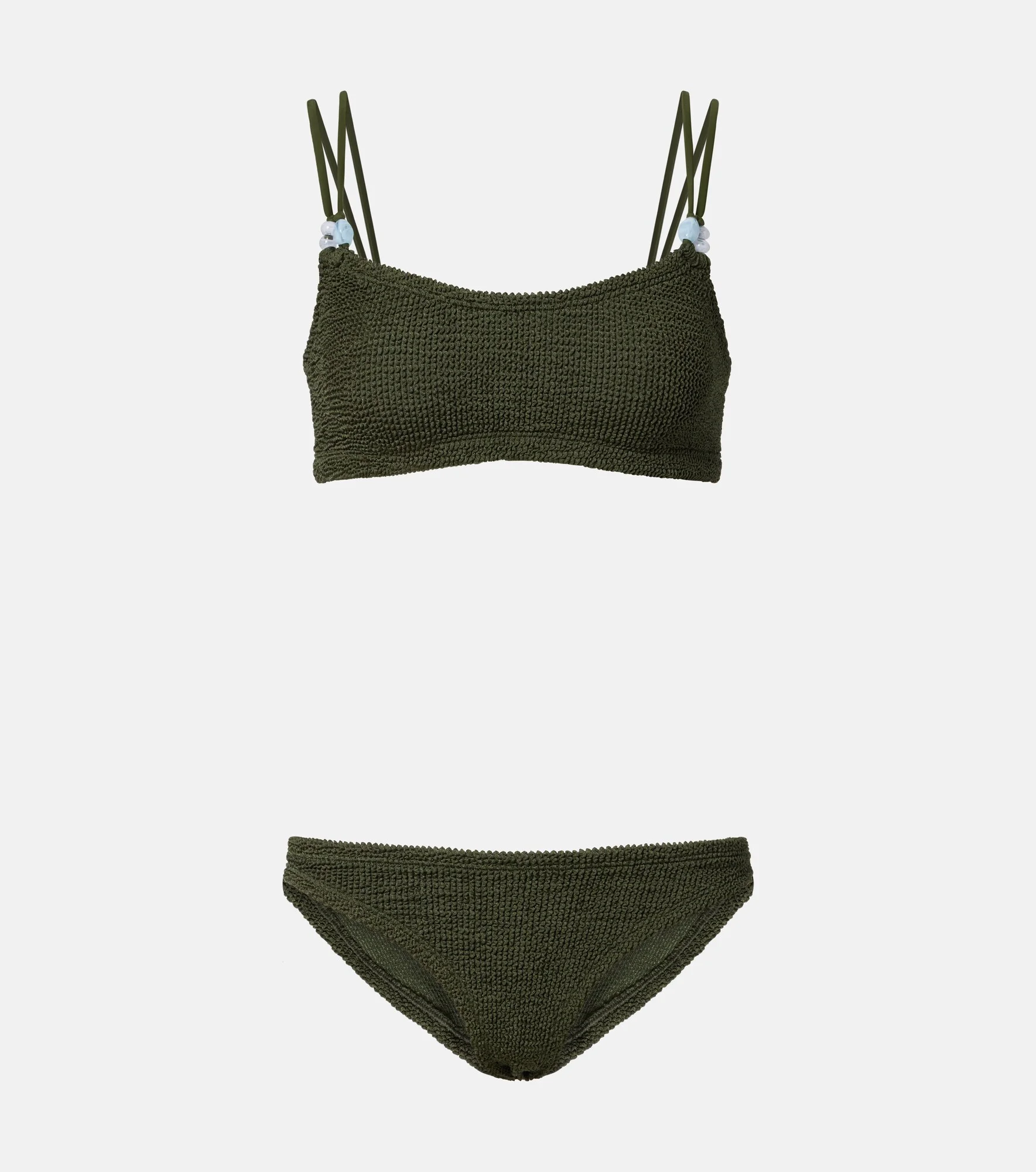 The Cassie bikini is made using Hunza G's Seamless Crinkle Technology, making it one-size-fits-all. The two-piece design is finished with delicate bead embellishments on the slender double shoulder straps. Product Details - Material: 97% polyamide, 3% elastane - Care instructions: machine wash at 30 degrees - Made in Morocco - Color: green - Designer color name: Metallic Khaki - Two-piece set - Item number: P01164286 Size & Fit - True to size - One size: perfect fit for sizes XS-M - Unpadded Top - High-cut leg
