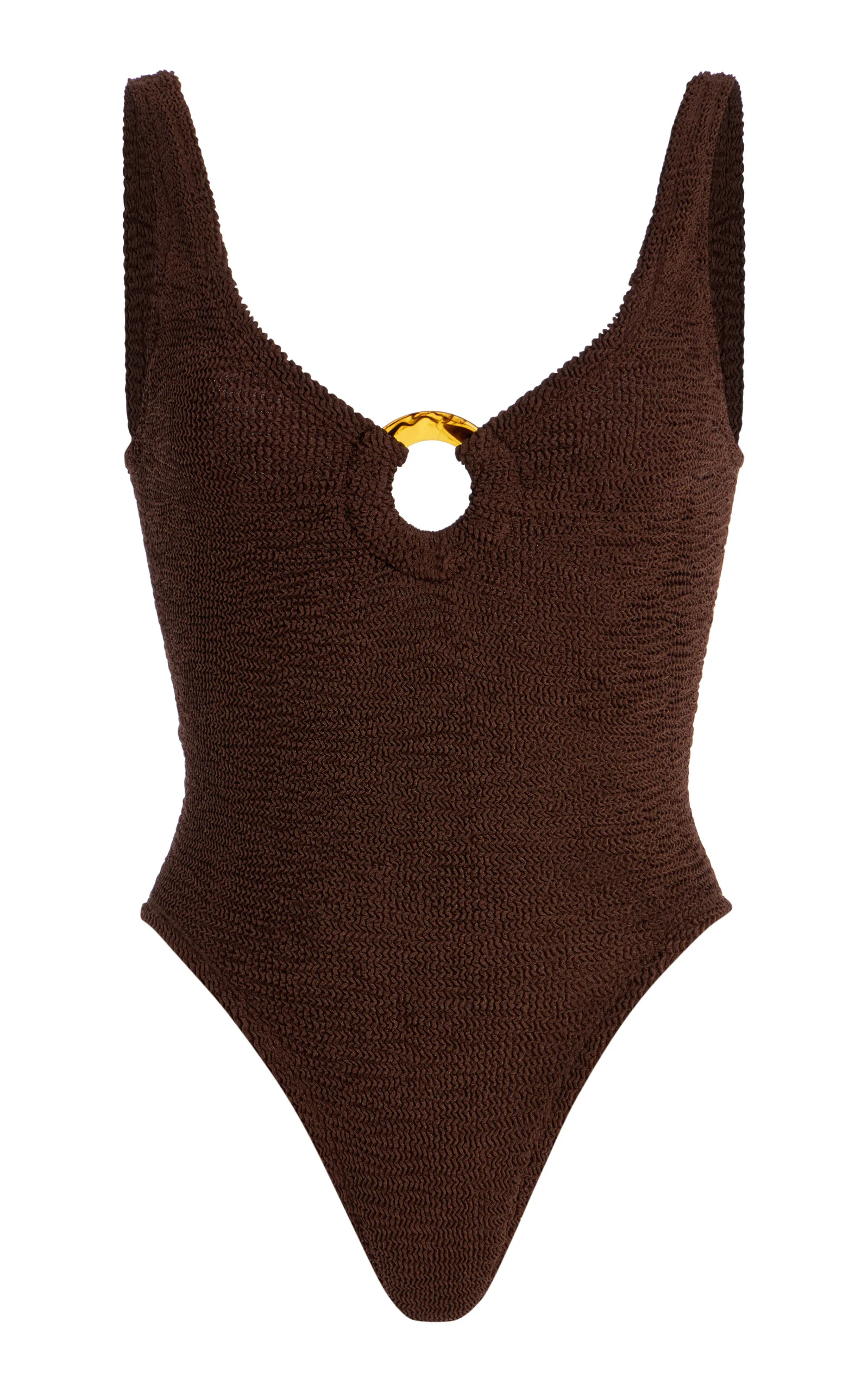 Hunza G first found fame in the '90s for the cutout mini worn by Julia Roberts in Pretty Woman — it became a must-have for women everywhere. Now under the direction of Georgiana Huddart, the London-based label is having a major moment with their swimsuits and bikinis sustainably made from signature seersucker. Modern swimsuit, timeless appeal. With tortoiseshell hoop detailing and a deep-V neckline, Celine has understated glamour down. PRODUCT DETAILS - Pre-Fall '25 - Slip on - Composition: 97% polyamide, 3% elastane - Designer color: Metallic Chocolate - Hand wash - Imported SIZE & FIT - Our model is 5'10" with a 32" bust, 23.5" waist, and 34.5" hip - One size only. This style comfortably fits those who are between a size XSmall-Large - Designed for full coverage