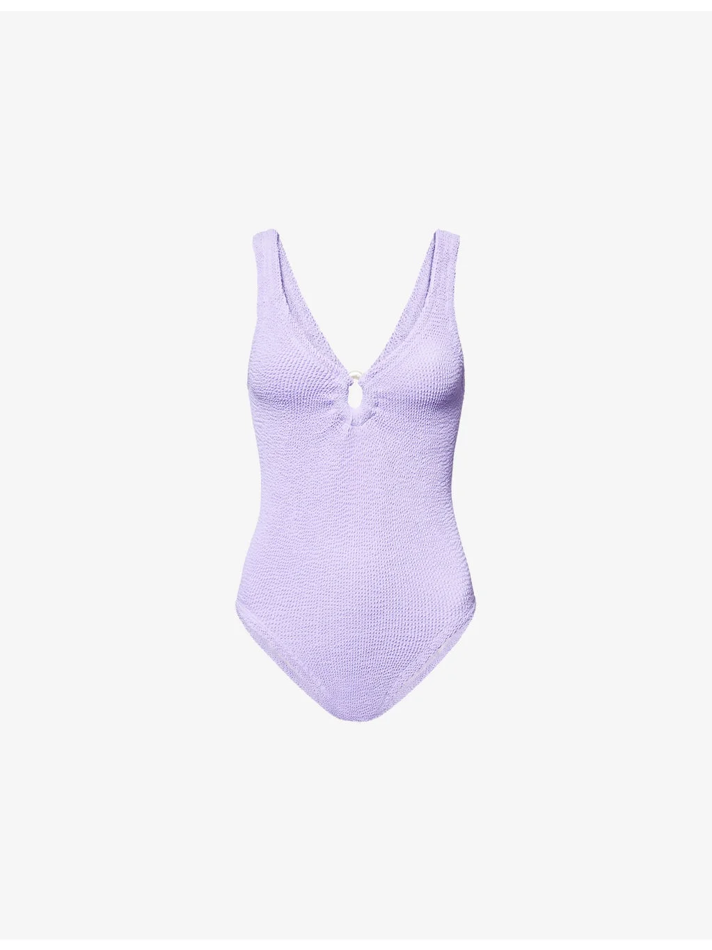 PRODUCT DETAILS - Hunza G swimsuit - 97% polyamide, 3% elastane - V-neckline, pearlescent hoop at chest, low scoop back, high leg, seersucker texture - Hand wash - Model is 5ft 10in / 1.78m and wears one size - Lightweight, stretchy - One size fits size UK 6 to 16 - For hygiene reasons, we are unable to exchange or refund this product if the protective adhesive strip has been removed. Ref: R04458706
