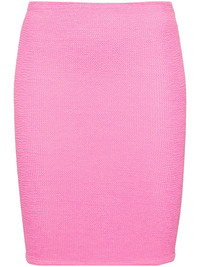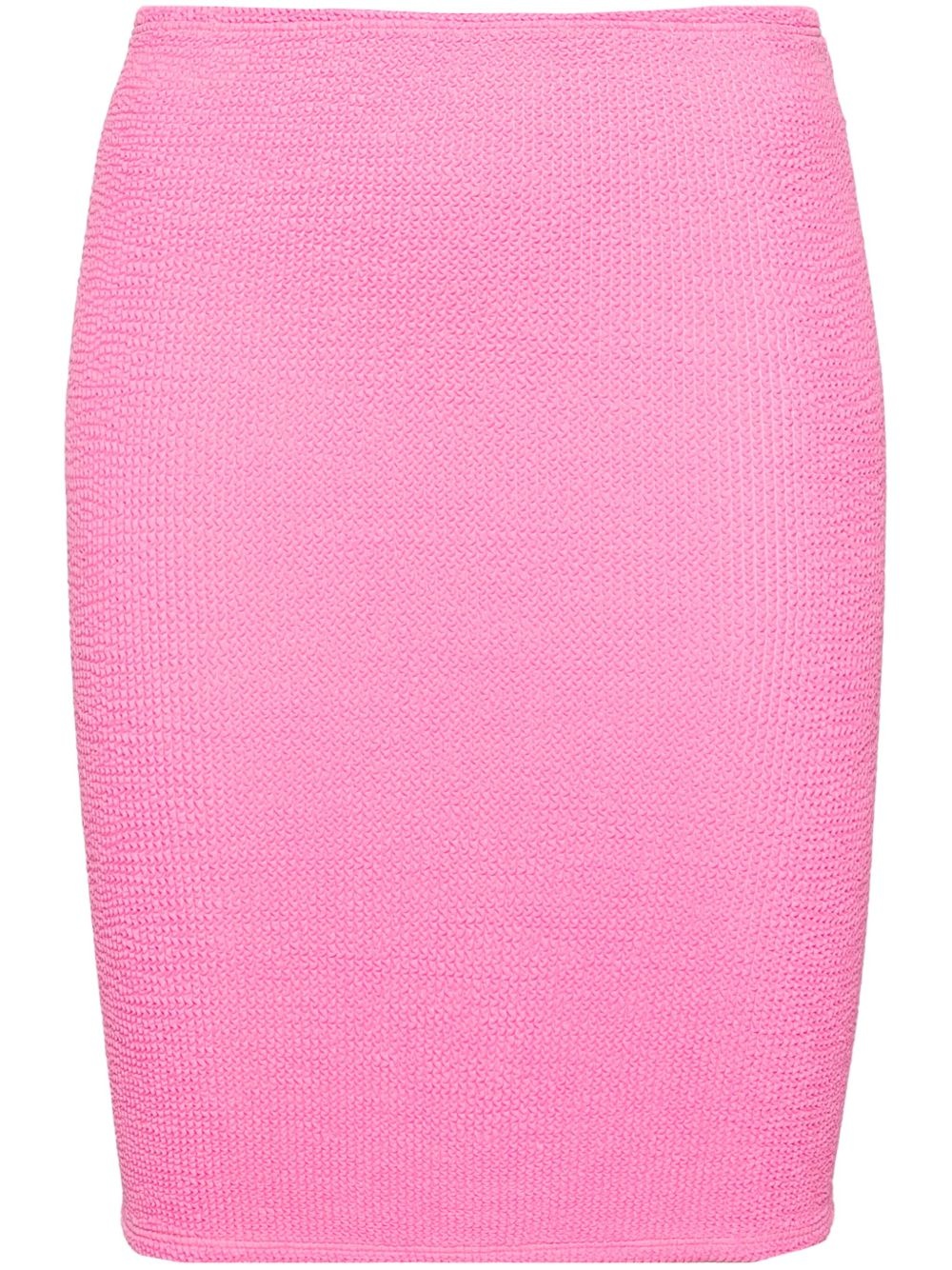 ruched textured miniskirt Highlights - Bubblegum pink - Textured finish - Ruched detailing - Slip-on style - Fitted waistline - Thigh-length Made in United Kingdom Composition Polyamide 97%, Spandex/Elastane 3% SIZE & FIT Model measurements Height 5 ft 11 in(1.8 m) Bust/Chest 34.25 in(87 cm) Hips 35.82 in(91 cm) Waist 24.8 in(63 cm) Measurement HIPS 16.53 in(42 cm) LENGTH 17.32 in(44 cm) WAIST 16.53 in(42 cm) FittingInformation This mini-length skirt is intended to be worn high on the waist Made from a midweight stretch fabric, this piece offers elasticity and flexibility when worn This piece is only produced in one size