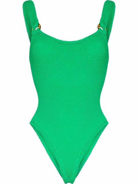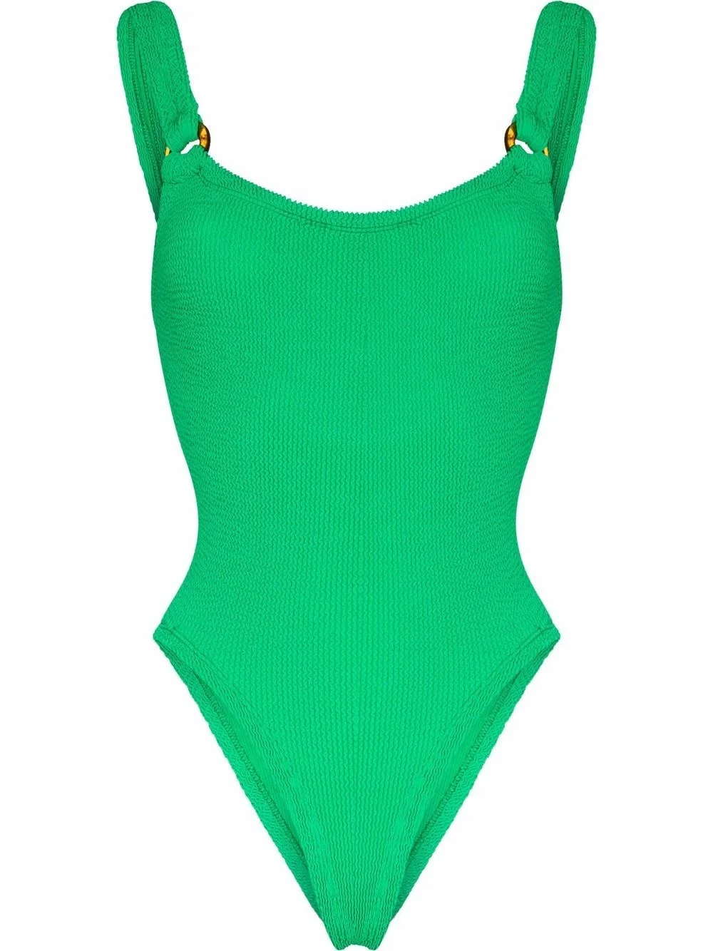 Domino crinkle-effect swimsuit Born in the '80s, Hunza G became famous for the cutout mini dress Julia Roberts wore in Pretty Woman. Today, the brand is known for flattering swimwear designed for the retro risk-taker. Imported Composition Nylon 96%, Lycra 4% SIZE & FIT Model measurements Height 5 ft 9 in(1.76 m) Bust/Chest 33.07 in(84 cm) Hips 38.58 in(98 cm) Waist 24.8 in(63 cm) Measurement BUST 16.53 in(42 cm) WAIST 16.53 in(42 cm) WIDTH 23.62 in(60 cm) FittingInformation This piece fits true to size. We recommend you get your regular size Made with a mid-weight stretch fabric Washing instructions Hand Wash