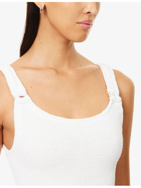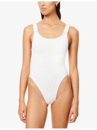 PRODUCT DETAILS - Hunza G swimsuit - 97% polyamide, 3% elastane - Scoop neckline, pearlescent hoops at straps, high leg, seersucker texture - Hand wash - Model is 5ft 10in / 1.78m and wears one size - Lightweight, stretchy - One size fits size UK 6 to 16 - For hygiene reasons, we are unable to exchange or refund this product if the protective adhesive strip has been removed. Ref: R04458718