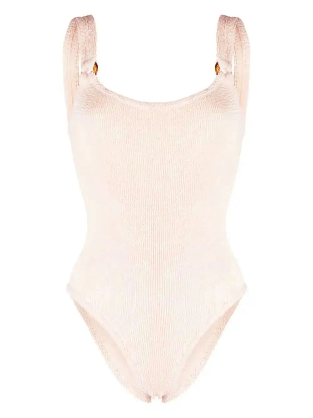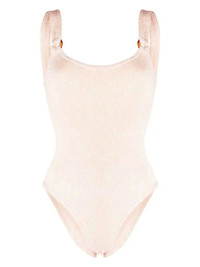 Domino ribbed one-piece Hunza G uses a signature crinkled swimwear fabric to create this light beige iteration of the Domino swimsuit, designed for a '90s-inspired high-cut silhouette with a revealing scoop back. Highlights - Light pink - Ribbed detailing - Square neck - Open back - Stretch-design - Be mindful to try on swimwear over your own garments. Imported Composition Nylon 96%, Elastane 4% SIZE & FIT Measurement BUST 19.68 in(50 cm) WAIST 19.68 in(50 cm)