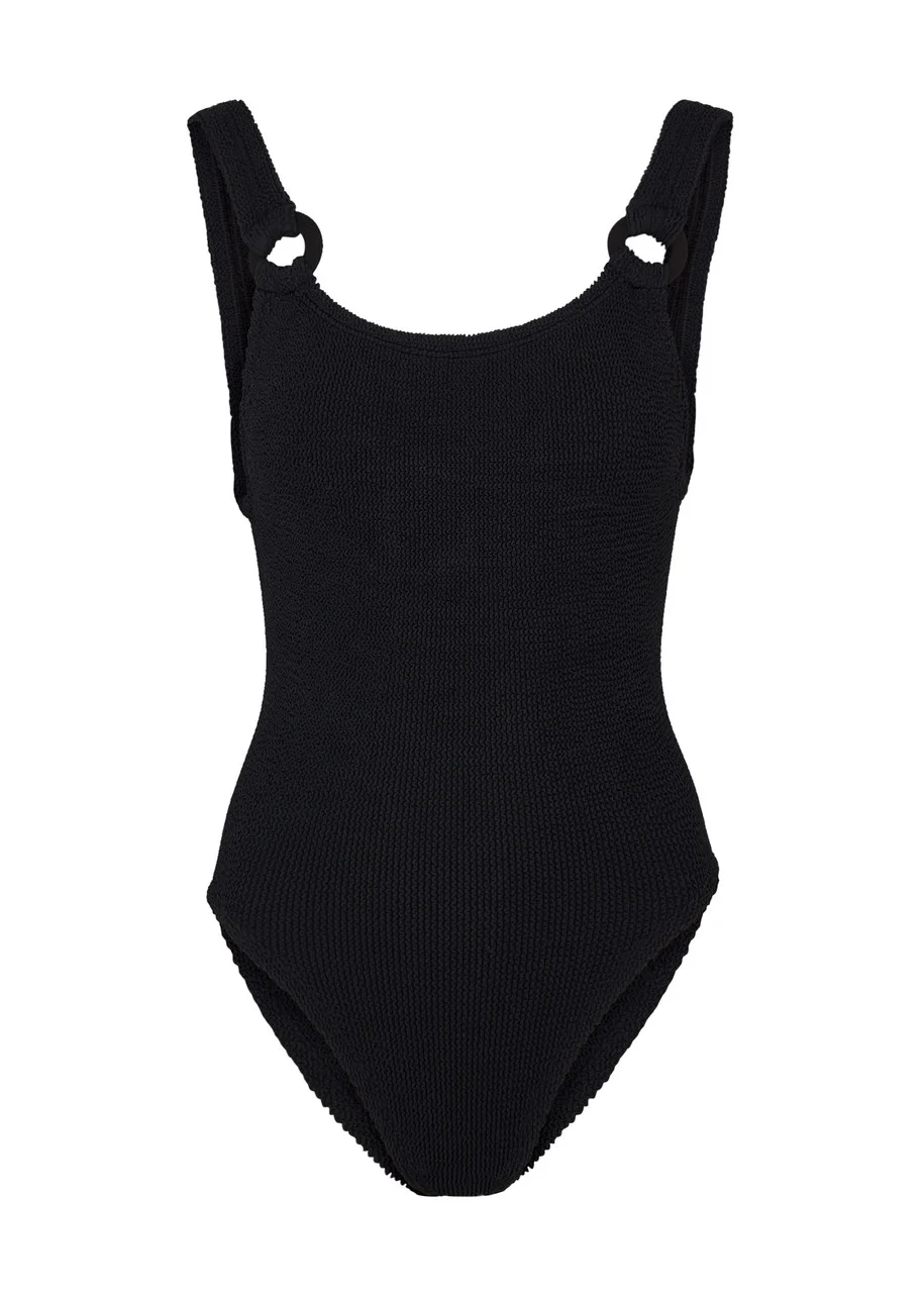 INFO & CARE - Hunza G seersucker swimsuit - Scoop-neck, elasticated, hoop details at shoulders, low back - 97% polyamide, 3% elastane - Hand wash SIZE & FIT - One size; will comfortably fit a size UK6-UK16