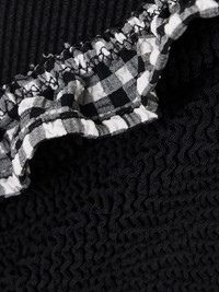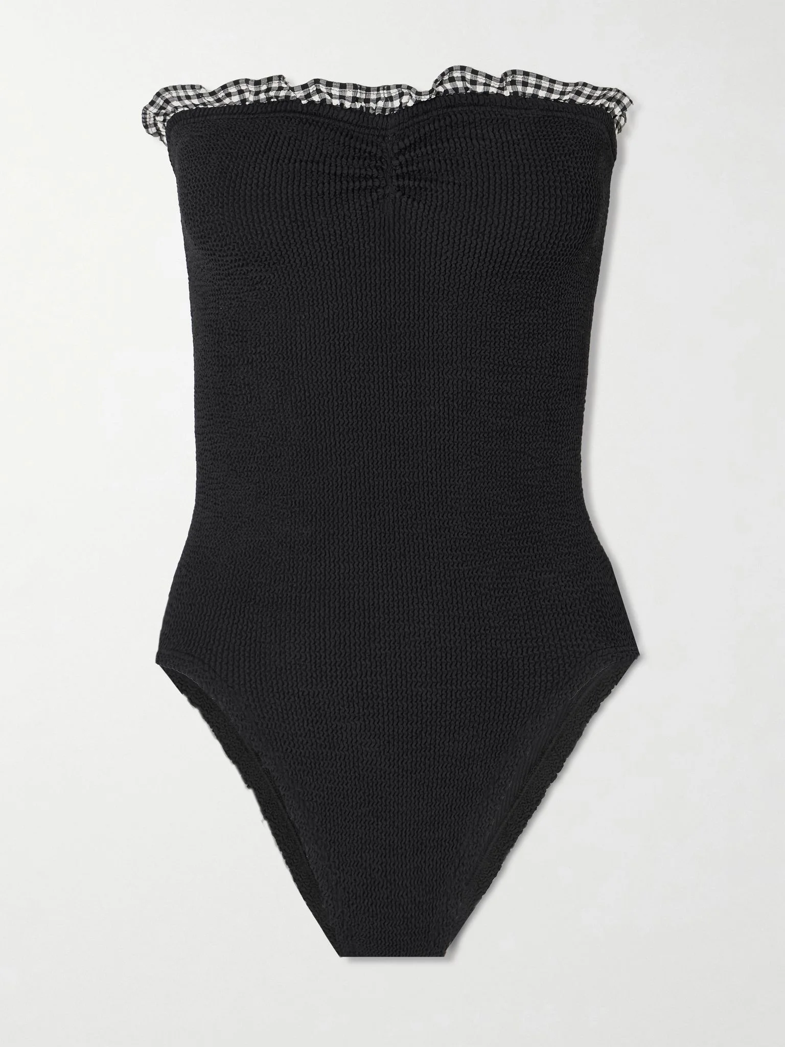 Hunza G's 'Dolly' swimsuit has the same shape as the brand's signature 'Brooke' style but with a retro twist. It's made from 'Crinkle™' seersucker and has a strapless neckline trimmed with gingham ruffles. The high cut elongates the look of your legs. Size & Fit - Comfortably fits those who are between a size XSmall-XXLarge - Model is 175cm/ 5'9" and normally wears a size XSmall Model measurements: - Bust: 84cm/ 33” - Waist: 65cm/ 25.5” - Hip: 91cm/ 36” Details & Care - Black and white seersucker - Pulls on - 97% polyamide, 3% elastane - Hand wash - Lotion, sunscreen, oil and chlorine can cause discoloration of this item; this is not a manufacturing defect. Please follow care instructions to keep your swimwear in the best condition