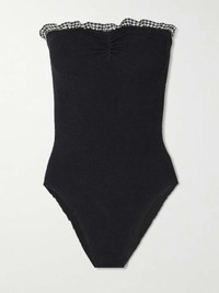 EDITORS'NOTES Hunza G's 'Dolly' swimsuit has the same shape as the brand's signature 'Brooke' style but with a retro twist. It's made from 'Crinkle™' seersucker and has a strapless neckline trimmed with gingham ruffles. The high cut elongates the look of your legs. SIZE & FIT Model measurements: - Comfortably fits those who are between a size XSmall-XXLarge - Model is 175cm/ 5'9" and normally wears a size XSmall - Bust: 84cm/ 33” - Waist: 65cm/ 25.5” - Hip: 91cm/ 36” DETAILS & CARE - Black and white seersucker - Pulls on - 97% polyamide, 3% elastane - Hand wash - Lotion, sunscreen, oil and chlorine can cause discoloration of this item; this is not a manufacturing defect. Please follow care instructions to keep your swimwear in the best condition