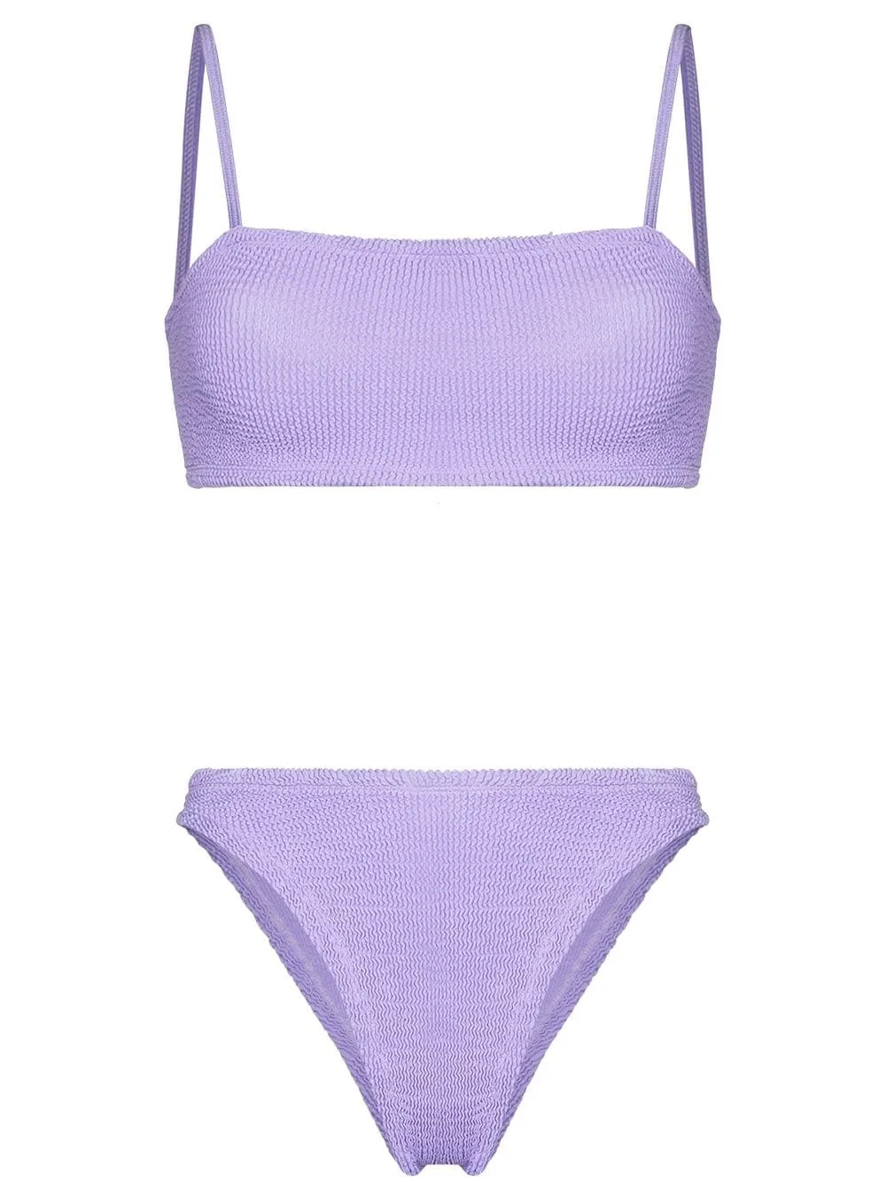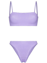 Gigi bikini set Hunza G. is most notably known for creating the iconic two-tone dress worn in the 1990 film Pretty Woman. Many years later, the brand is still in demand for its bright colour palettes, terrycloth dresses and simple swimwear, like this lavender Gigi two-piece bikini. Highlights - Lilac purple - Stretch-design - Crinkled finish - Top: - Square neck - Spaghetti straps - Square open back - Bottoms: - Classic bottoms - Mid-rise - High cut - Be mindful to try on swimwear over your own garments. Made in United Kingdom Composition Polyamide 97%, Elastane 3% SIZE & FIT Measurement BUST 10.23 in(26 cm) HIPS 11.41 in(29 cm) Washing instructions Hand Wash