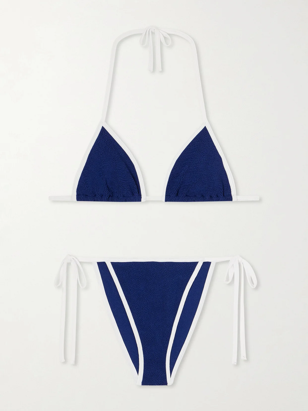 Hunza G's 'Gina' bikini offers a subtle nod to nautical style with its striking white and blue contrast. It's made from the brand's signature Original Crinkle™ and has adjustable ties.