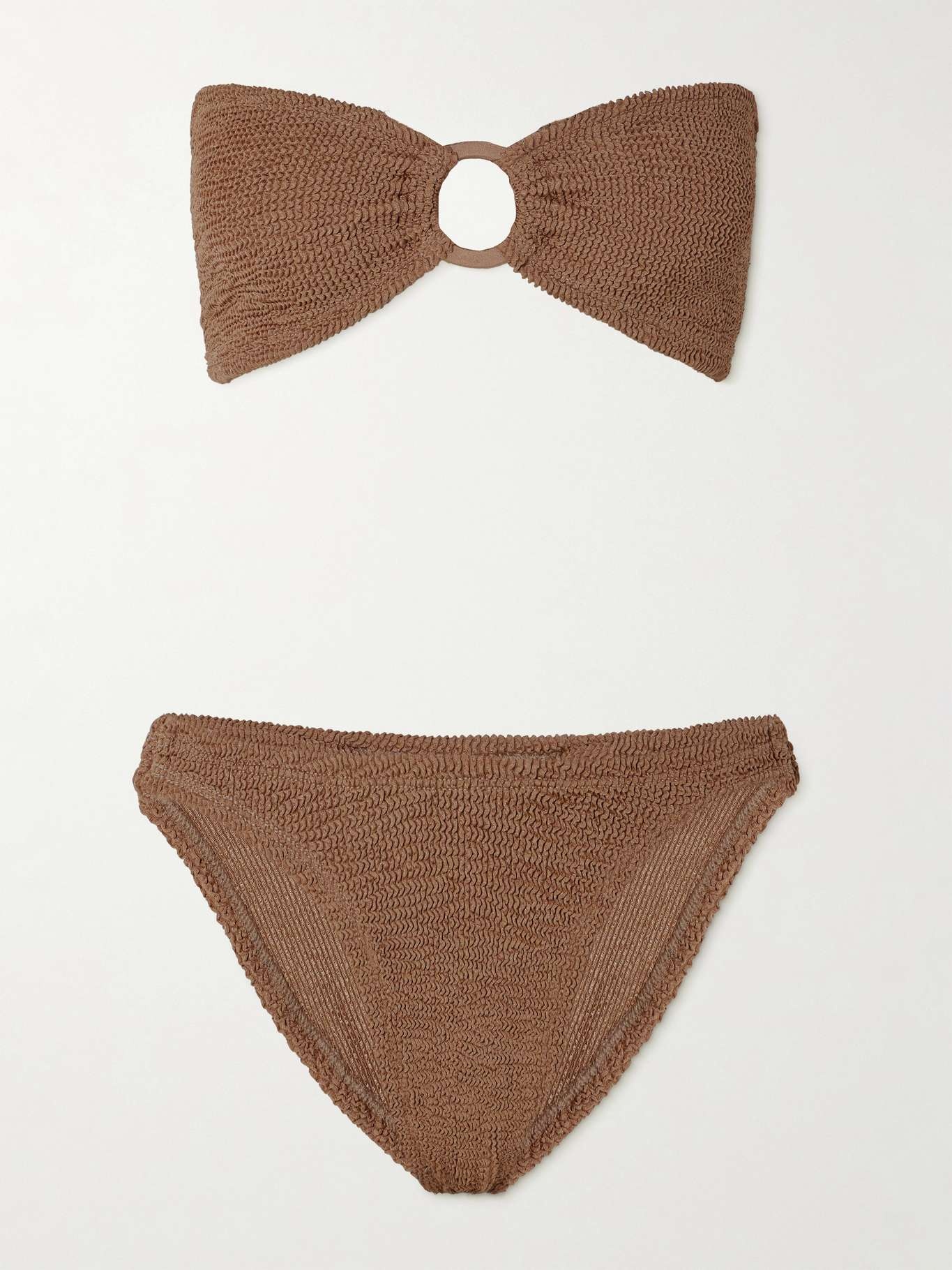 EDITORS'NOTES Hunza G's 'Gloria' bikini is cut from the label’s signature 'Crinkle™' seersucker that beautifully hugs your frame. Flecked with metallic threads that shimmer in the sunshine, this set has a bandeau top and high-cut briefs, each embellished with tonal hoops. SIZE & FIT - Comfortably fits those who are between a size XSmall-XXLarge - Model is 177cm/ 5'10" and normally wears a size Small DETAILS & CARE - Brown metallic seersucker - Slips on - 97% polyamide, 3% elastane - Hand wash - Lotion, sunscreen, oil and chlorine can cause discoloration of this item; this is not a manufacturing defect. Please follow care instructions to keep your swimwear in the best condition
