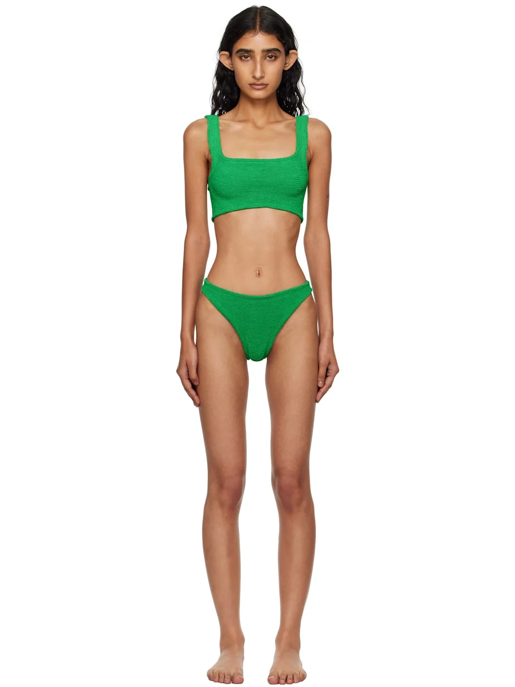 Shirred stretch nylon jersey bikini top and bottom. · Square neck · Integrated shoulder straps · Low back · Unlined This product uses Original Crinkle™ Technology. Fits US size 2-12. Supplier color: Emerald 97% polyamide, 3% elastane. Made in Morocco 252431F105000