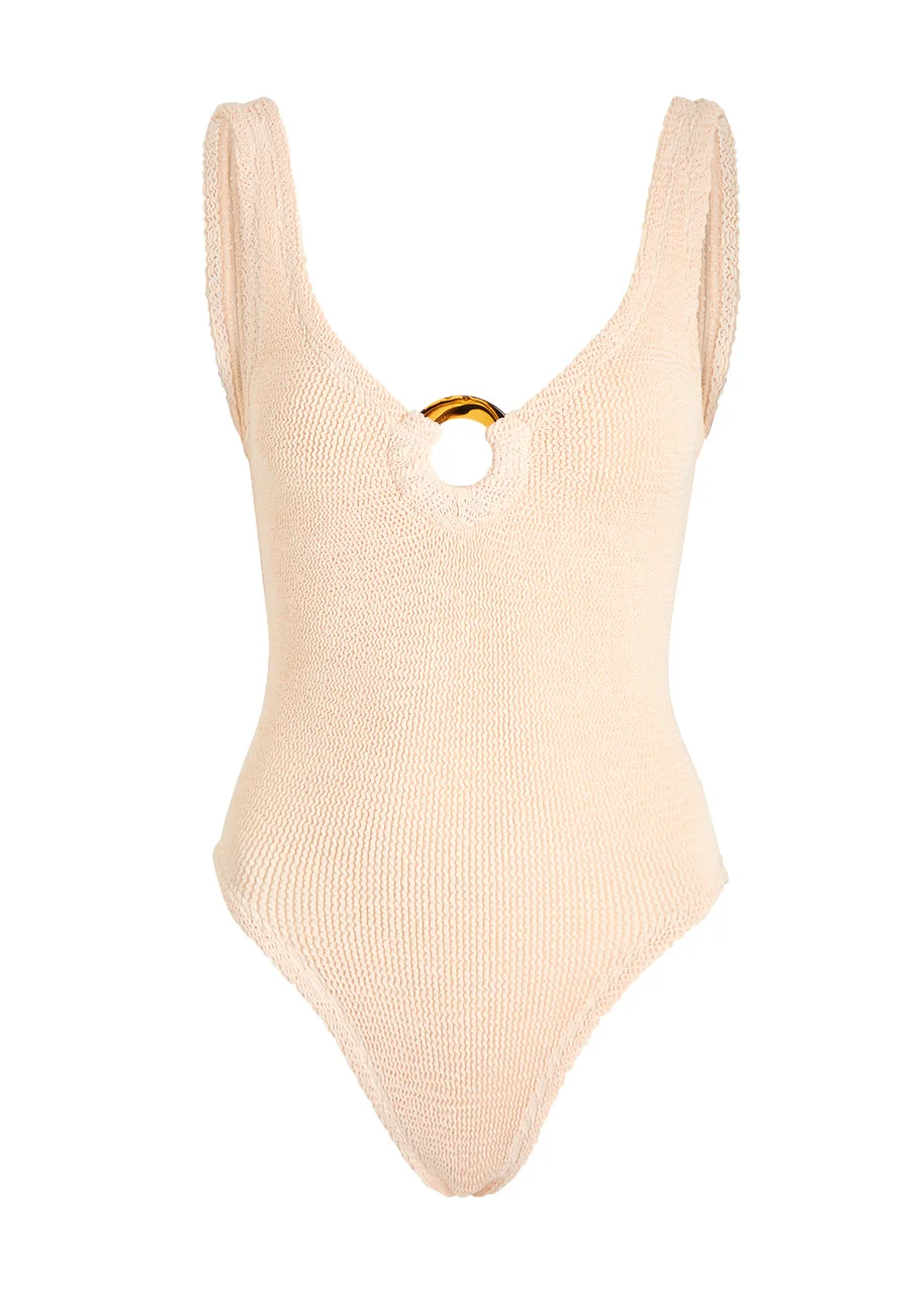 Info & Care Hunza G seersucker swimsuit; V-neck, cut-out ring detail at front; 97% polyamide, 3% elastane; Machine wash; Size & Fit High-leg cut; One size; will comfortably wear a size UK6-UK16