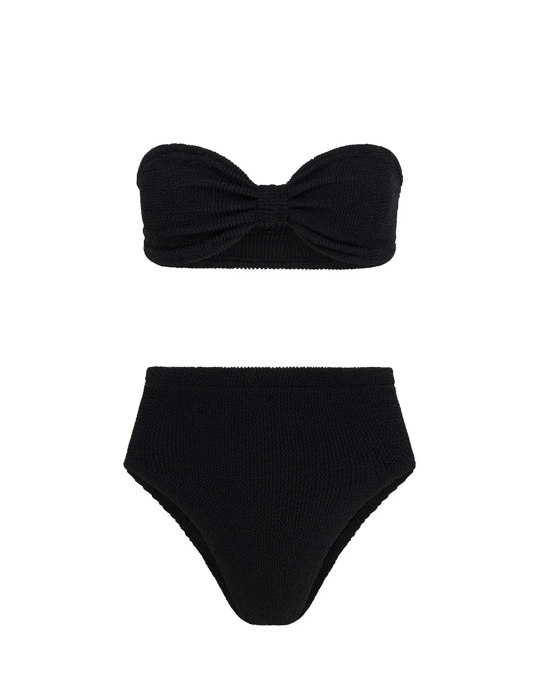 The Ruby Bikini in Black by Hunza G is a vintage inspired two-piece featuring a bow shaped bandeau and high-waisted bikini bottoms. - Hunza G's Original Crinkle™fabrication stretches to flex, sculpt, and support every curve, adapting to all body types in a unique one-size-fit to provide confidence and style for every body. The one-size design offers a custom-like fit for UK 6-16 (US 2-12). Hunza G swimwear returns to its original shape after every wear, making it a timeless choice for your swim collection – made for whatever life brings.