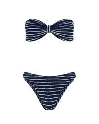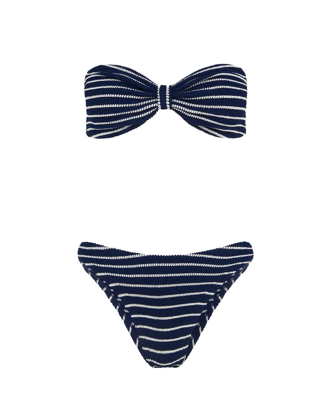 The Jean Bikini in Navy and White Stripe by Hunza G is a strapless, knot front swimsuit with classic coverage briefs and light bust support crafted in their signature crinkle fabrication. - Hunza G's Original Crinkle™fabrication stretches to flex, sculpt, and support every curve, adapting to all body types in a unique one-size-fit to provide confidence and style for every body. The one-size design offers a custom-like fit for UK 6-16 (US 2-12). Hunza G swimwear returns to its original shape after every wear, making it a timeless choice for your swim collection – made for whatever life brings.
