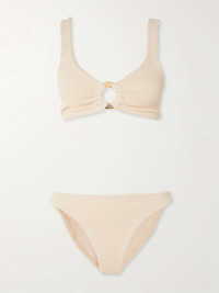 EDITORS'NOTES Hunza G's bikini is named for its signature O-ring - a cutout detail originally made famous by Julia Roberts in Pretty Woman . It's made from the label's signature Crinkle™ seersucker, which is soft and supportive. SIZE & FIT - Comfortably fits those who are between a size XSmall-XXLarge - Model is 175cm/ 5'9" and normally wears a size XSmall DETAILS & CARE - Ivory seersucker - Slips on - 97% polyamide, 3% elastane - Lotion, sunscreen, oil and chlorine can cause discoloration of this item; this is not a manufacturing defect. Please follow care instructions to keep your swimwear in the best condition