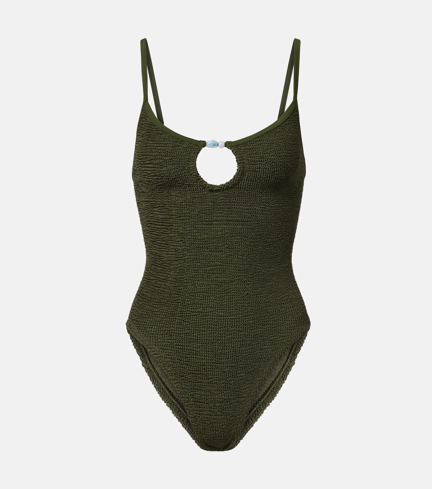 The Mia swimsuit from Hunza G features a chic, beaded cutout detail front and center. This piece is made using the brand's Seamless Crinkle Technology, making it one-size-fits-all. Product Details - Material: 97% polyamide, 3% elastane - Care instructions: machine wash at 30 degrees - Made in Morocco - Color: green - Designer color name: Metallic Khaki - Item number: P01164285 Size & Fit - True to size - One size: perfect fit for sizes XS-L - Unpadded Top - High-cut leg
