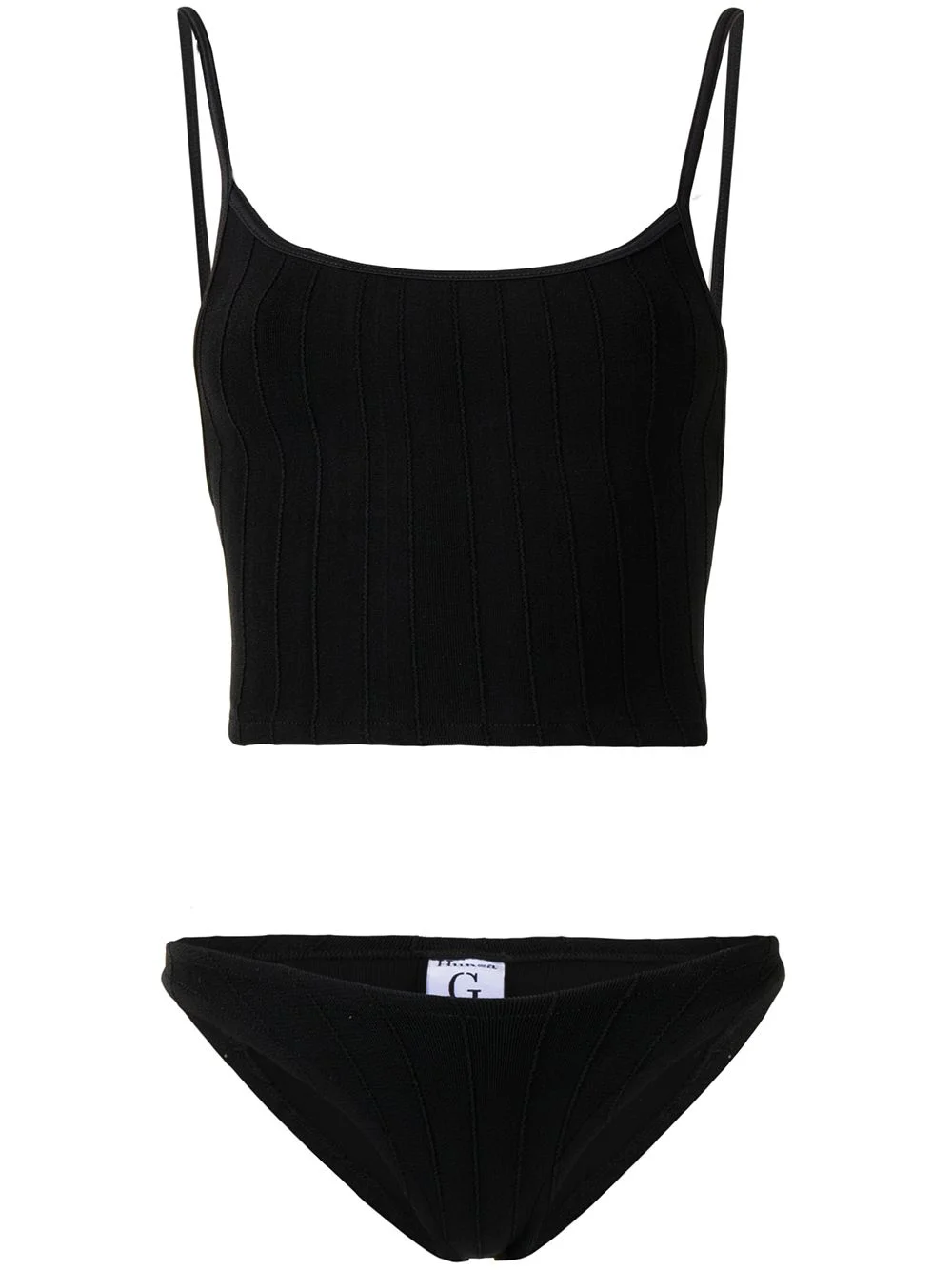 Nile two-piece bikini black knitted construction ribbed detailing stretch-design Top: spaghetti straps scoop back cropped Bottoms: low-rise Be mindful to try on swimwear over your own garments. Made in United Kingdom Composition Nylon 88%, Lycra 12% SIZE & FIT Measurement BUST 19.68 in(50 cm) HIPS 23.62 in(60 cm) WAIST 17.32 in(44 cm) Washing instructions Hand Wash
