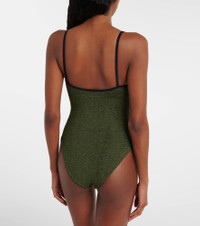 The Pamela swimsuit features a scooped neckline and thin straps. This swimwear piece is made using Hunza G's Seamless Crinkle Technology, making it one-size-fits-all. Product Details - Material: 97% polyamide, 3% elastane - Care instructions: machine wash at 30 degrees - Made in the UK - Designer color name: Metallic Khaki/Black - Item color: green, black - Item number: P01052575 Size & Fit - True to size - One size: perfect fit for sizes XS-L - Unpadded Top - High-cut leg - One size