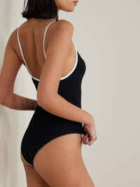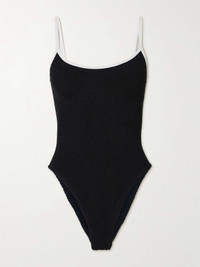 EDITORS'NOTES Fans of Hunza G's seersucker already know how comfortable it feels while remaining supportive, and newbies are in for a treat. With a contrasting neckline, this 'Pamela' swimsuit has high-cut legs and thin straps. SIZE & FIT Model measurements: - Comfortably fits those who are between a size XSmall-XXLarge and all body shapes - High-cut style with medium brief coverage - Bust: 79cm/ 31" - Waist: 64cm/ 25" - Hip: 97cm/ 38" DETAILS & CARE - Black and white seersucker - Pulls on - 97% polyamide, 3% elastane - Hand wash - Lotion, sunscreen, oil and chlorine can cause discoloration of this item; this is not a manufacturing defect. Please follow care instructions to keep your swimwear in the best condition