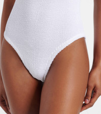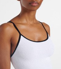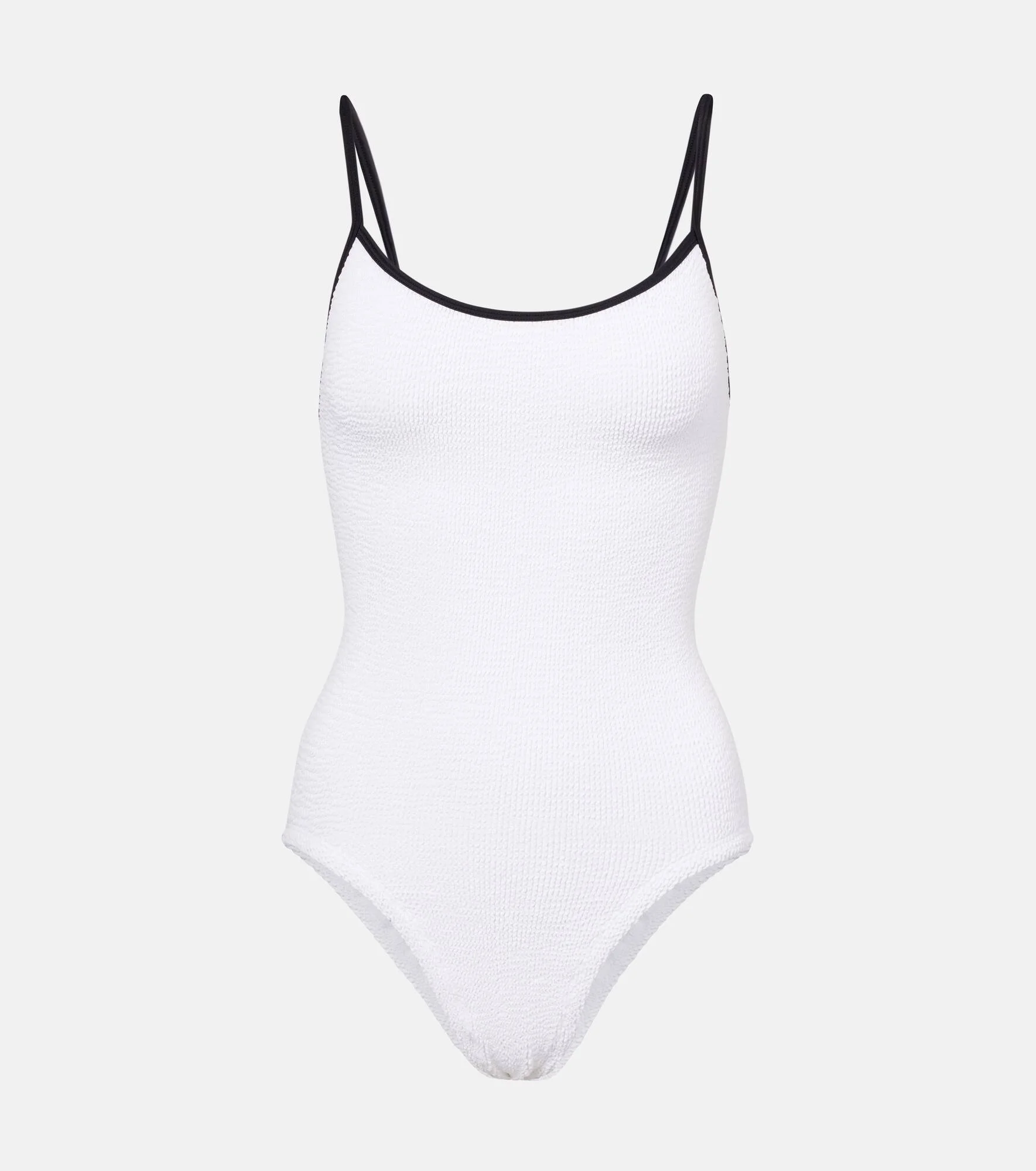 Primed for sunny getaways and beyond, the Pamela swimsuit from Hunza G deserves a spot in your vacation suitcase. This swimwear piece is made using Hunza G's Seamless Crinkle Technology, making it one-size-fits-all. It's completed with delicate straps, contrasting trims, and a scooped neckline. Product Details - Material: 97% polyamide, 3% elastane - Care instructions: machine wash at 30 degrees - Made in the UK - Designer color name: White/Black - Item color: white - Item number: P01052558 Size & Fit - True to size - One size: perfect fit for sizes XS-L - Unpadded Top - High-cut leg