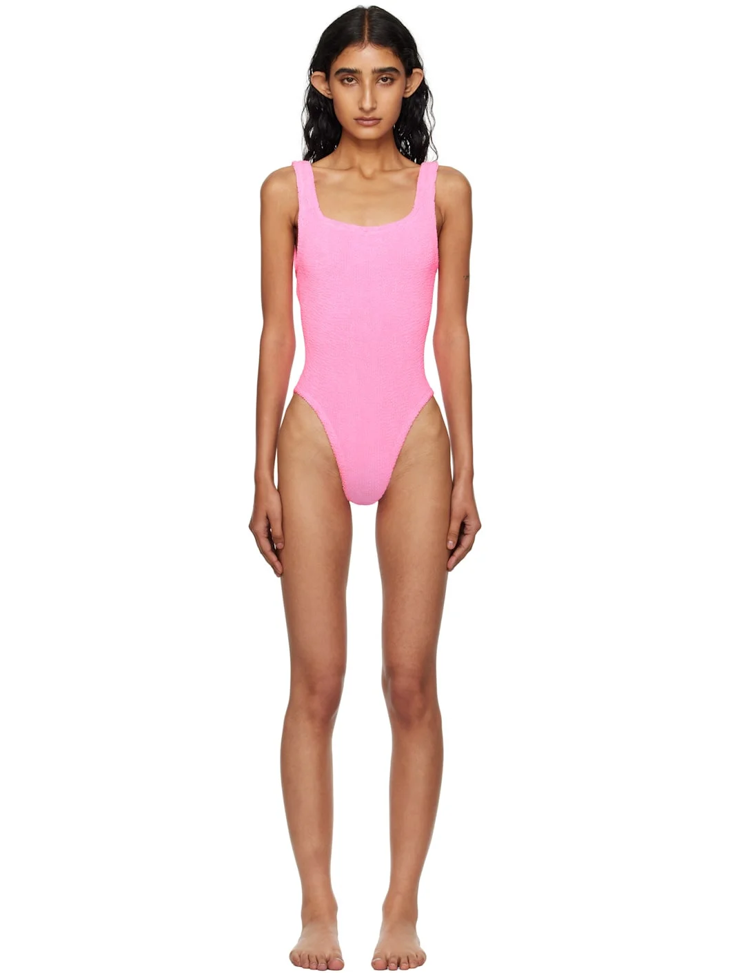 Shirred stretch nylon jersey one-piece swimsuit. · Square neck · Integrated shoulder straps · Low back · Unlined This product uses Original Crinkle™ Technology. Fits US size 2-12. Supplier color: Bubblegum 97% polyamide, 3% elastane. Made in Morocco 252431F103005