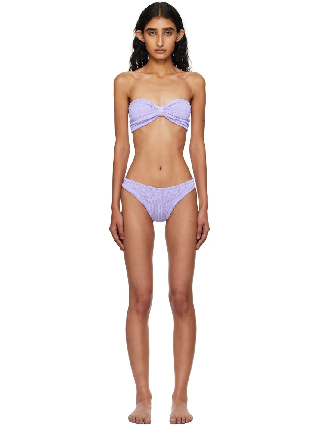 Shirred stretch nylon jersey bikini top and bottom. · Gathering at sweetheart neck · Unlined This product uses Seamless Crinkle™ Technology. Fits US size 2-12. Supplier color: Lilac 97% polyamide, 3% elastane. Made in Morocco 252431F105021