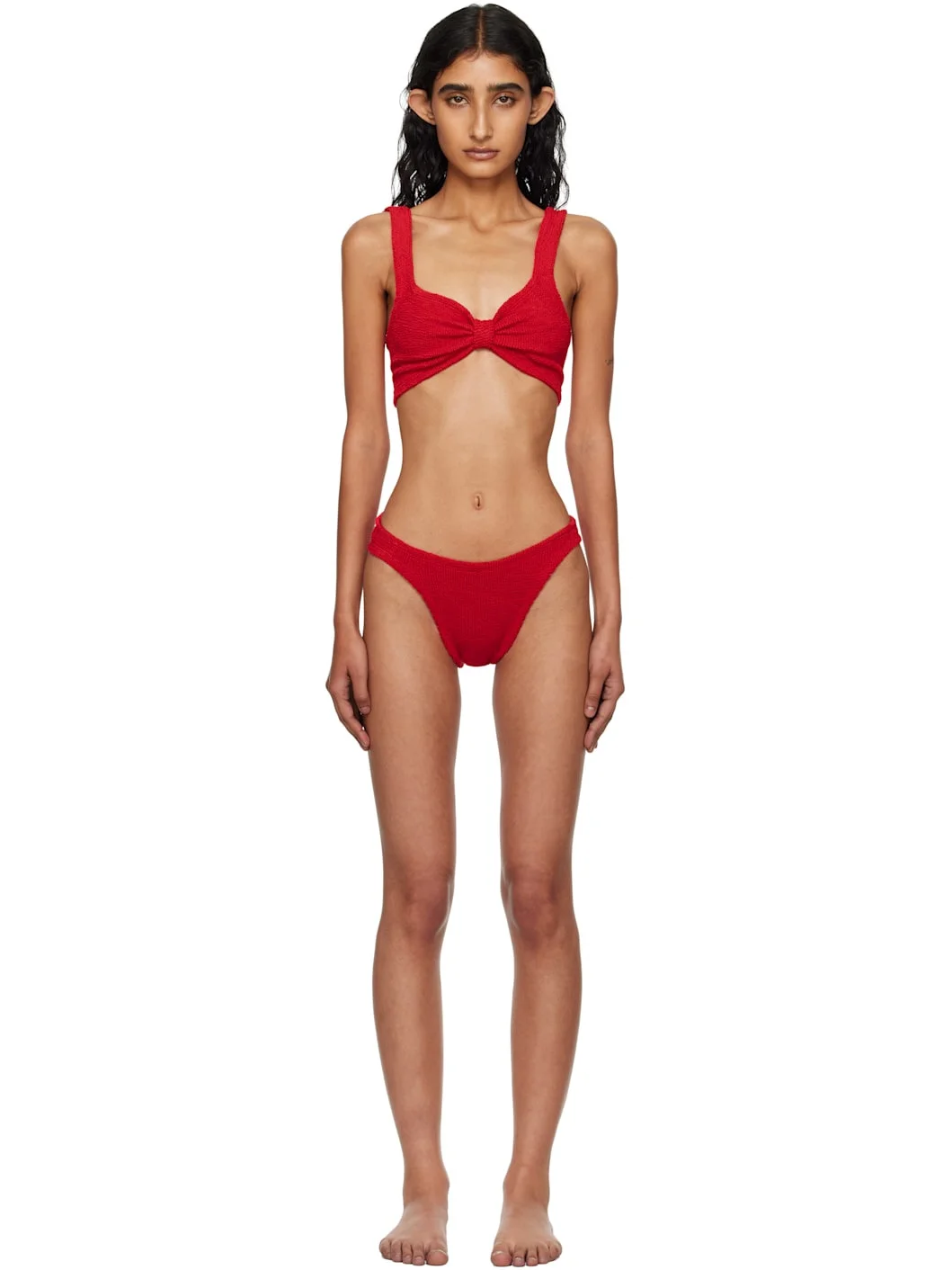 Shirred stretch nylon jersey bikini top and bottom. · Gathering at scoop neck · Integrated shoulder straps · Low back · Unlined This product uses Seamless Crinkle™ Technology. Fits US size 2-12. Supplier color: Red 97% polyamide, 3% elastane. Made in Morocco 252431F105029