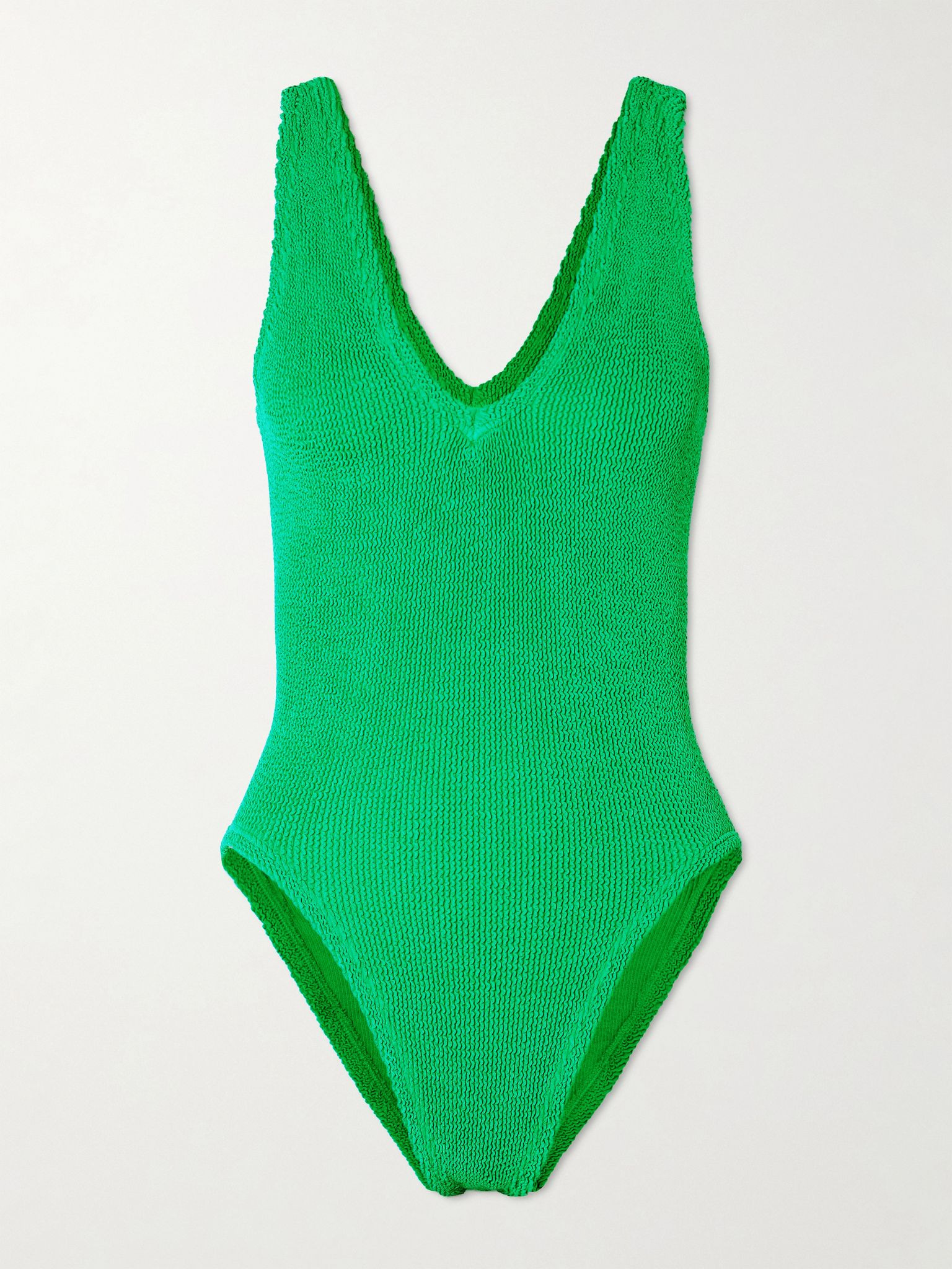 Hunza G's 'Sadie' swimsuit is made from the label's signature 'Crinkle™' seersucker that's soft, supportive and stretches to fit most sizes. It offers medium coverage and has a plunging neckline and scooped back. Size & Fit - Comfortably fits those who are between a size XSmall-XXLarge - Model is 175cm/ 5'9" and normally wears a size XSmall Model measurements: - Bust: 84cm/ 33” - Waist: 65cm/ 25.5” - Hip: 91cm/ 36” Details & Care - Emerald seersucker - Pulls on - 97% polyester, 3% elastane - Machine wash at 30° with similar colors - Lotion, sunscreen, oil and chlorine can cause discoloration of this item; this is not a manufacturing defect. Please follow care instructions to keep your swimwear in the best condition