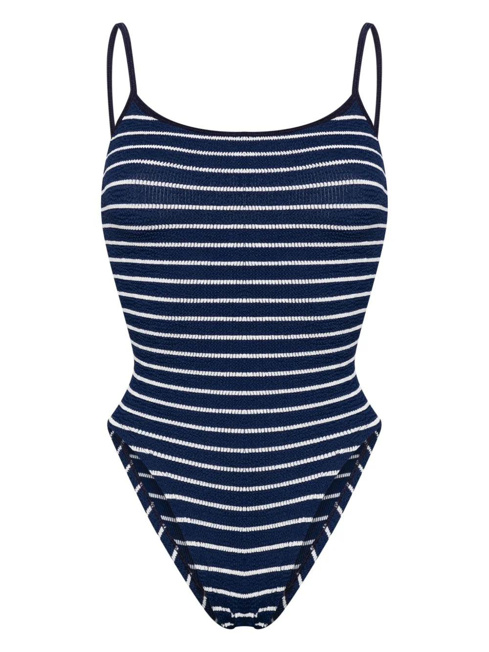 Pamela striped swimsuit With a one-size-fits-all approach to swimwear, British label Hunza G. creates elegant and timeless pieces. The Pamela swimsuit is realised here in a navy blue hue and features the brand's signature crinkled detailing for a textured finish. Highlights - Navy blue/white - Stretch-design - Textured finish - Horizontal stripe print - Square neck - Spaghetti straps - Be mindful to try on swimwear over your own garments. Made in United Kingdom Composition Polyamide 78%, Recycled Polyester 19%, Lycra 3% SIZE & FIT Measurement BUST 19.68 in(50 cm) HIPS 17.32 in(44 cm) LENGTH 20.47 in(52 cm) WAIST 16.53 in(42 cm) Washing instructions Machine Wash