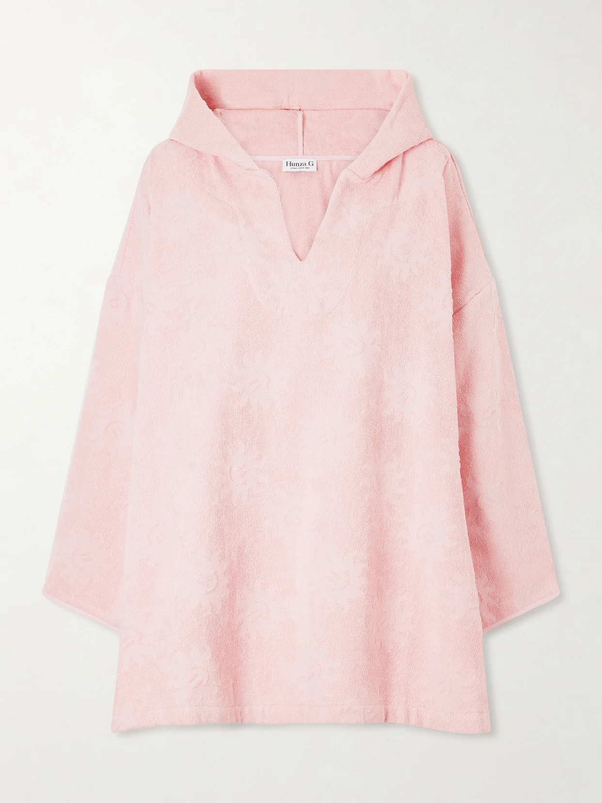 Hunza G applies its focus on form-fitting construction and tactile finishes to ready-to-wear. This hooded cover-up is made from plush cotton terry with an all-over sun jacquard pattern. Layer it over swimwear for beach or poolside days.