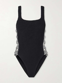 EDITORS'NOTES Hunza G's signature 'Crinkle™' seersucker debuted in 1984 and is beloved for its stretchy, supportive feel. Designed for medium coverage with a square neckline, this 'Tiffany' swimsuit has skin-baring cutouts along the sides with sweet gingham bows. SIZE & FIT Model measurements: - Comfortably fits those who are between a size XSmall-XXLarge - Model is 175cm/ 5'9" and normally wears a size XSmall - Bust: 84cm/ 33” - Waist: 65cm/ 25.5” - Hip: 91cm/ 36” DETAILS & CARE - Black and white seersucker - Pulls on - 97% polyamide, 3% elastane - Hand wash - Lotion, sunscreen, oil and chlorine can cause discoloration of this item; this is not a manufacturing defect. Please follow care instructions to keep your swimwear in the best condition