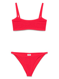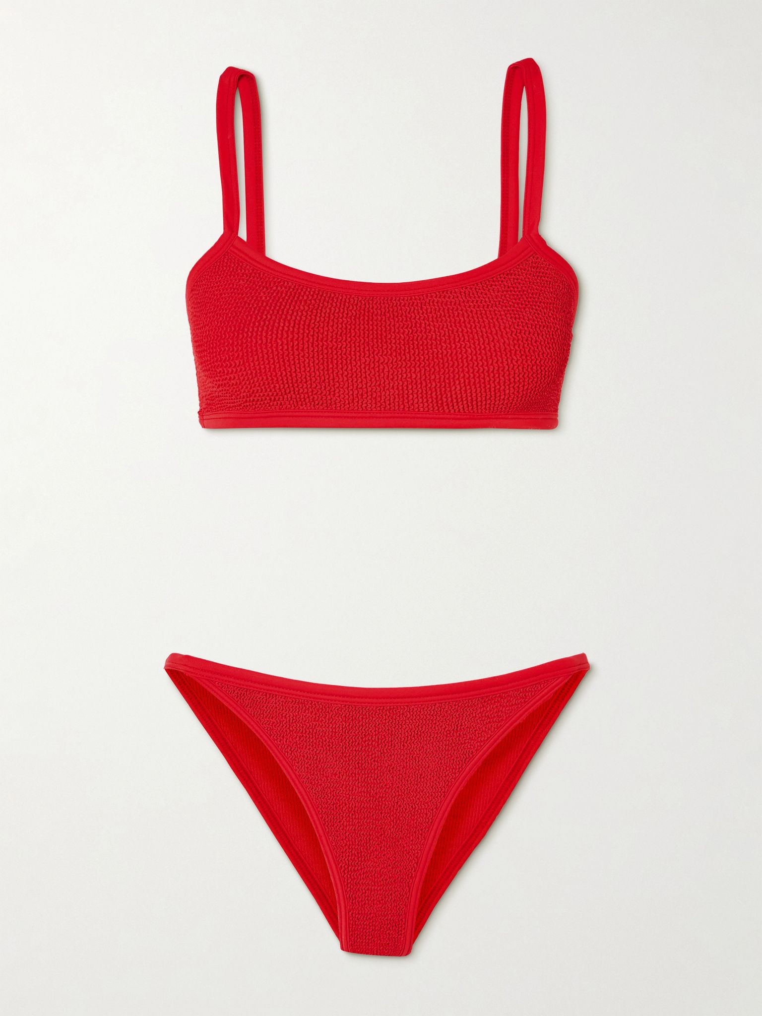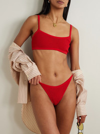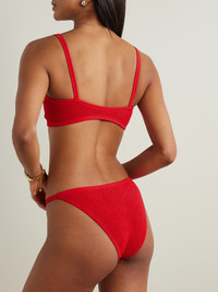 Hunza G's swimwear stands out thanks to its innovative 'Crinkle™' seersucker that's supportive, sculpting and flexes to fit. This 'Tyler' bikini has a comfortable square-neck top and high-cut briefs. Wear yours with the matching skirt at the beachside bar. Size & Fit - Comfortably fits those who are between a size XSmall-XXLarge - Mid-rise briefs with medium coverage - Model is 177cm/ 5'10", bra size 32A and normally wears a size XSmall Model measurements: - Bust: 79cm/ 31” - Waist: 64cm/ 25” - Hip: 91cm/ 36” Details & Care - Red seersucker - Pulls on - 97% polyamide, 3% elastane - Machine wash at 30° with similar colors - Lotion, sunscreen, oil and chlorine can cause discoloration of this item; this is not a manufacturing defect. Please follow care instructions to keep your swimwear in the best condition