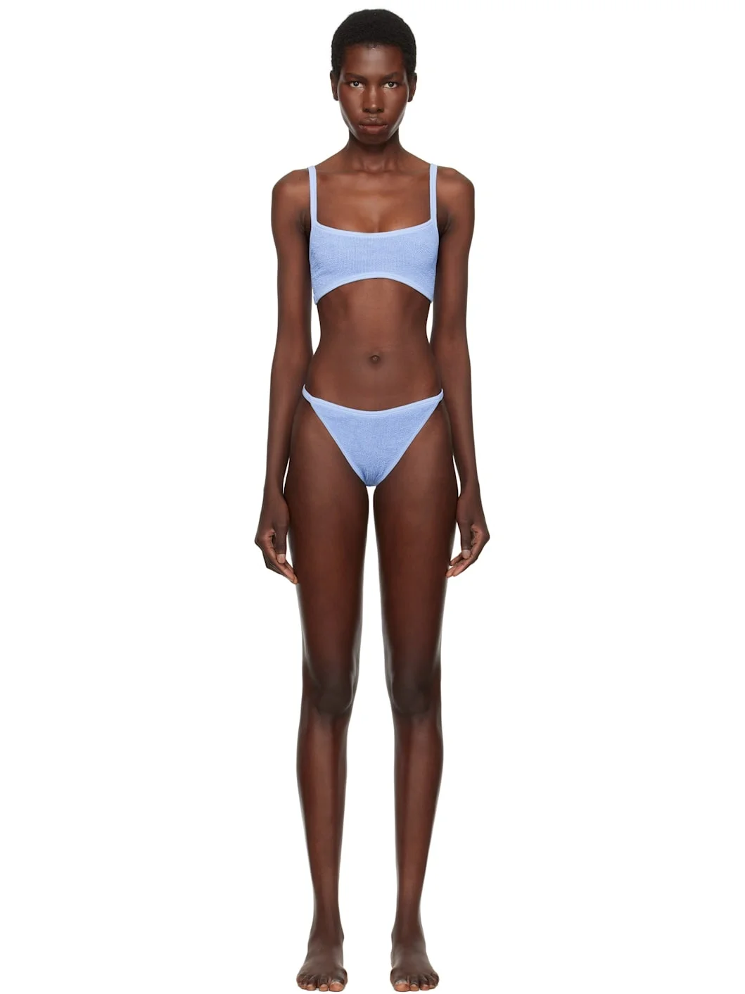 Shirred stretch nylon jersey bikini top. · Square neck · Fixed spaghetti straps · Unlined Shirred stretch nylon jersey bikini bottom. · Elasticized waistband · Unlined This product uses Original Crinkle™ Technology. Fits US sizes 2-12. Supplier color: Cornflower 97% polyamide, 3% elastane. Made in Morocco 251431F105059