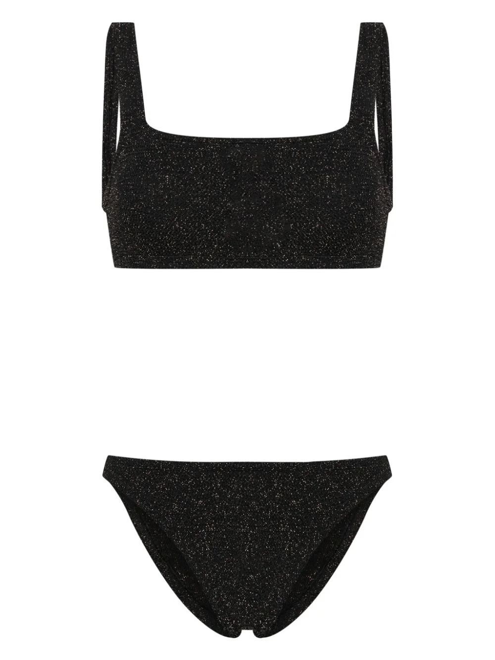 Xandra shirred bikini Infused with Hunza G's Seamless Crinkle technology in a vivid orange hue, the Xandra bikini set testifies to the label's modern aesthetic whilst its dual strap top has an angular neckline for added support. Highlights - Black/gold-tone - Stretch-design - Shirred effect - Thin straps - Sleeveless - Square neck - Scoop back - Classic bottoms - Pull-on style - Be mindful to try on swimwear over your own garments. Imported Composition Polyamide 78%, RPES Recycled Polyester 19%, Lycra 3% SIZE & FIT Measurement BUST 19.68 in(50 cm) Washing instructions Hand Wash