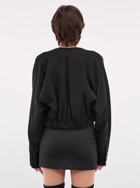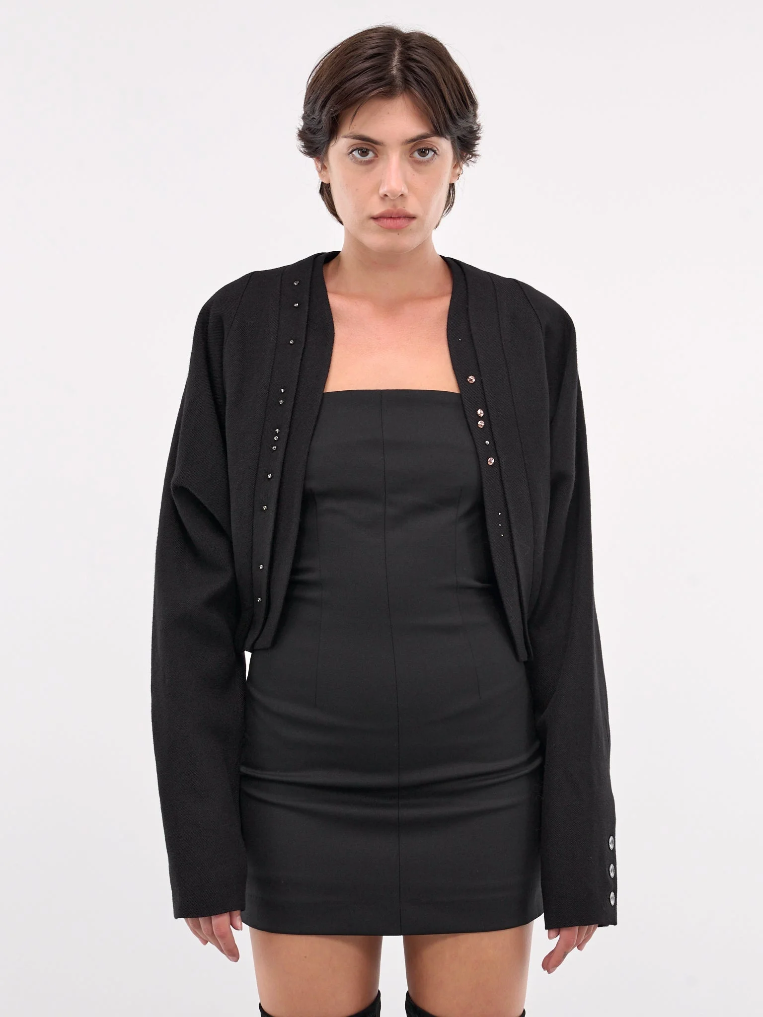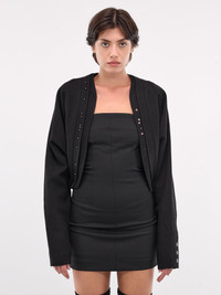 HYEIN SEO jacket in black, wool-linen blend, paneled construction, rounded neck, open front, beaded silver charm embellishment, long sleeves, surgeon's cuffs, elasticated hem, lined, relaxed fit. Outer: 60% Wool 40% Linen Inner: 80% Rayon 20% Polyester Hardware: 925 Sterling Silver Numeric Sizing Model is 5'8" wearing size 1. Bust: 32" Waist: 24" Hips: 36"