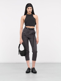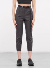 HYEIN SEO trousers in grey, paneled polyester construction, high-waisted, belt loops, integrated belt & silver-tone buckle, front concealed zip fly closure, pleated, inset pockets, back slash pockets, cropped length, tapered leg, slim fit. Made in Korea Outer: 100% Polyester Belt: 100% Nylon & Brass Numeric Sizing Model is 5'8" wearing size 1. Bust: 32" Waist: 26" Hips: 34.5"