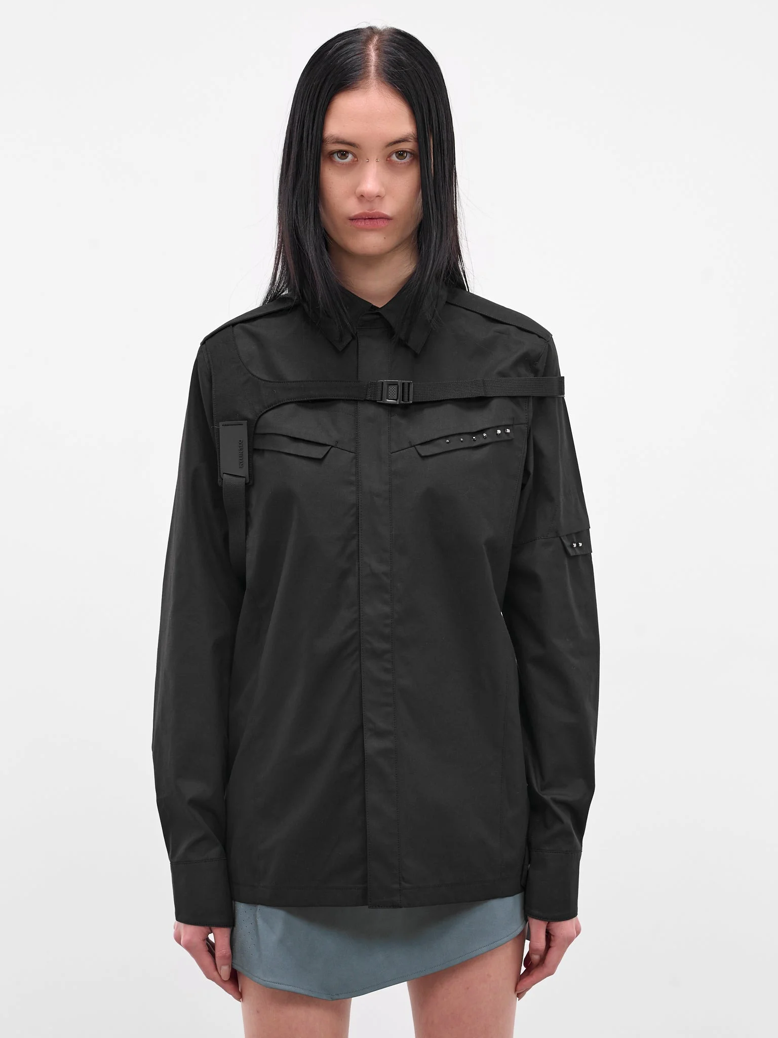 Black shirt with a technical shoulder strap overlay. Finished with studded flaps and multiple utility-style pockets. Featuring: • Relaxed fit • Pointed collar • Concealed button placket closure • Shoulder epaulets • Long sleeves with button cuffs • Flap pockets at chest and sleeves • Studded flap detailing • 100% Cotton • Numeric sizing Model is 5'8" wearing size 1. Bust: 28.5" Waist: 22.5" Hips: 33.5"