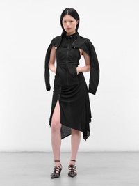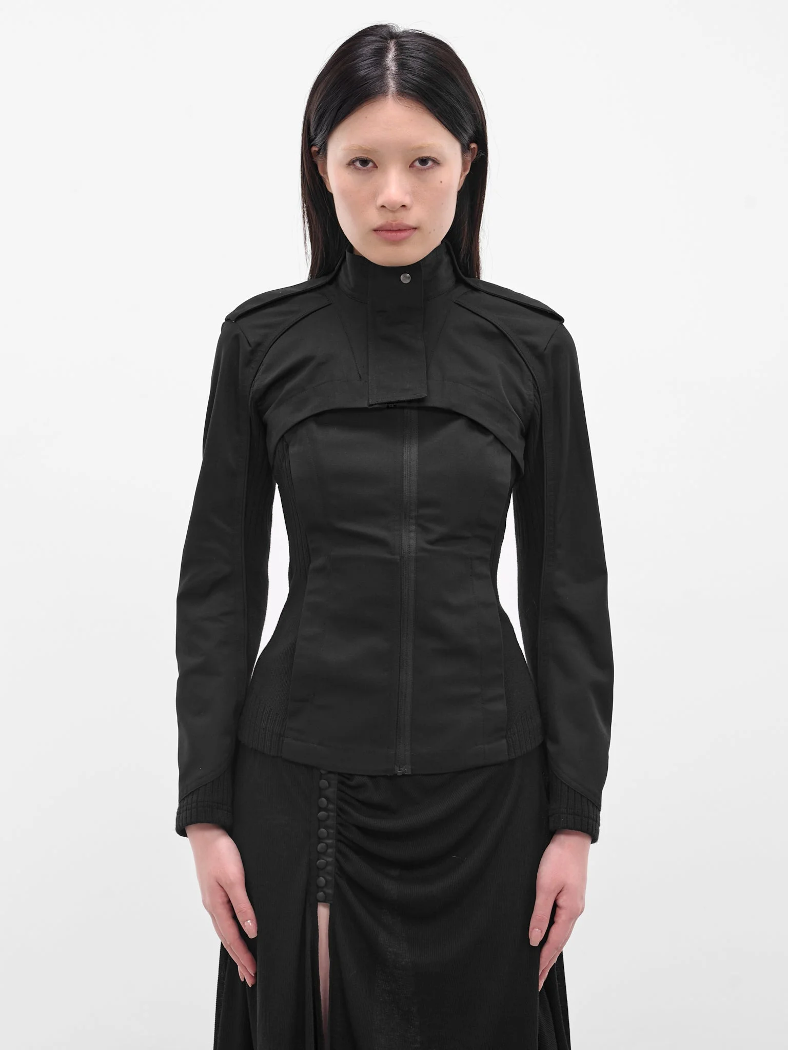 This innovative black Hyein Seo jacket features a versatile two-piece, layered moto design. Crafted from a technical fabric, the piece can be worn together or separated into a long-sleeved outer layer and a sleeveless underlayer jacket. Featuring: • Slim fit • Two-piece layered moto jacket design • Stand collar with a concealed zip closure • Shoulder epaulets and side pockets • Crafted from a technical fabric • Made in South Korea • Composition: 80% Polyester 20% Cotton | 65% Acrylic 30% Wool 5% Spandex • Numeric sizing Model is 5'7" wearing size 1. Bust: 30" Waist: 24" Hips: 35"