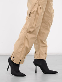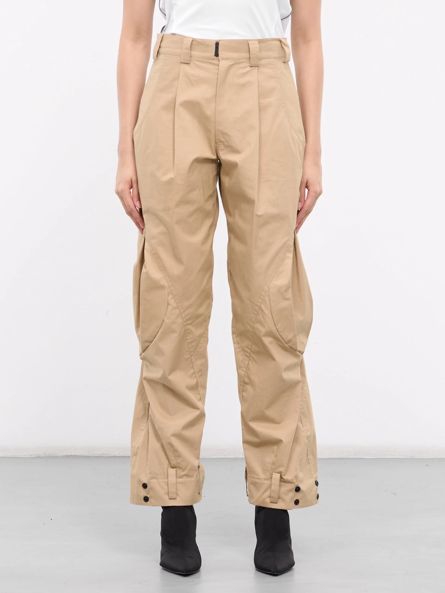 HYEIN SEO trousers in beige, paneled cotton construction, belt loops, front slide fastening & concealed zip fly closure, pleated, inset pockets, back welt pockets, side curved flap pockets & pleating, hem belt loops & adjustable snap-buttons, straight leg, loose fit. Made in Korea 100% Cotton Numeric Sizing Model is 5'8" wearing size 1. Bust: 32" Waist: 26" Hips: 34.5"