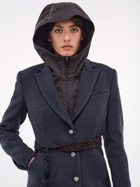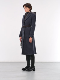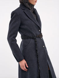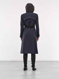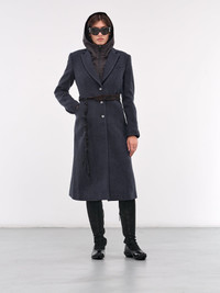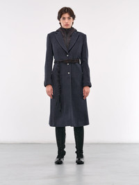 HYEIN SEO coat in navy, wool-cashmere blend, paneled construction, notched lapel, front ceramic button closure, structured shoulders, long sleeves, cuff vents, back flap, chest welt pocket, waist braided belt, straight hem, tailored fit. Outer: 91% Wool 9% Cashmere Inner: 100% Polyester Hardware: 100% Ceramic Belt: 60% Nylon 30% Acrylic 6% Wool 4% Polyester Numeric Sizing Model is 5'8" wearing size 1. Bust: 32" Waist: 24" Hips: 36"