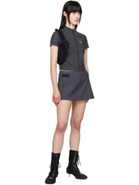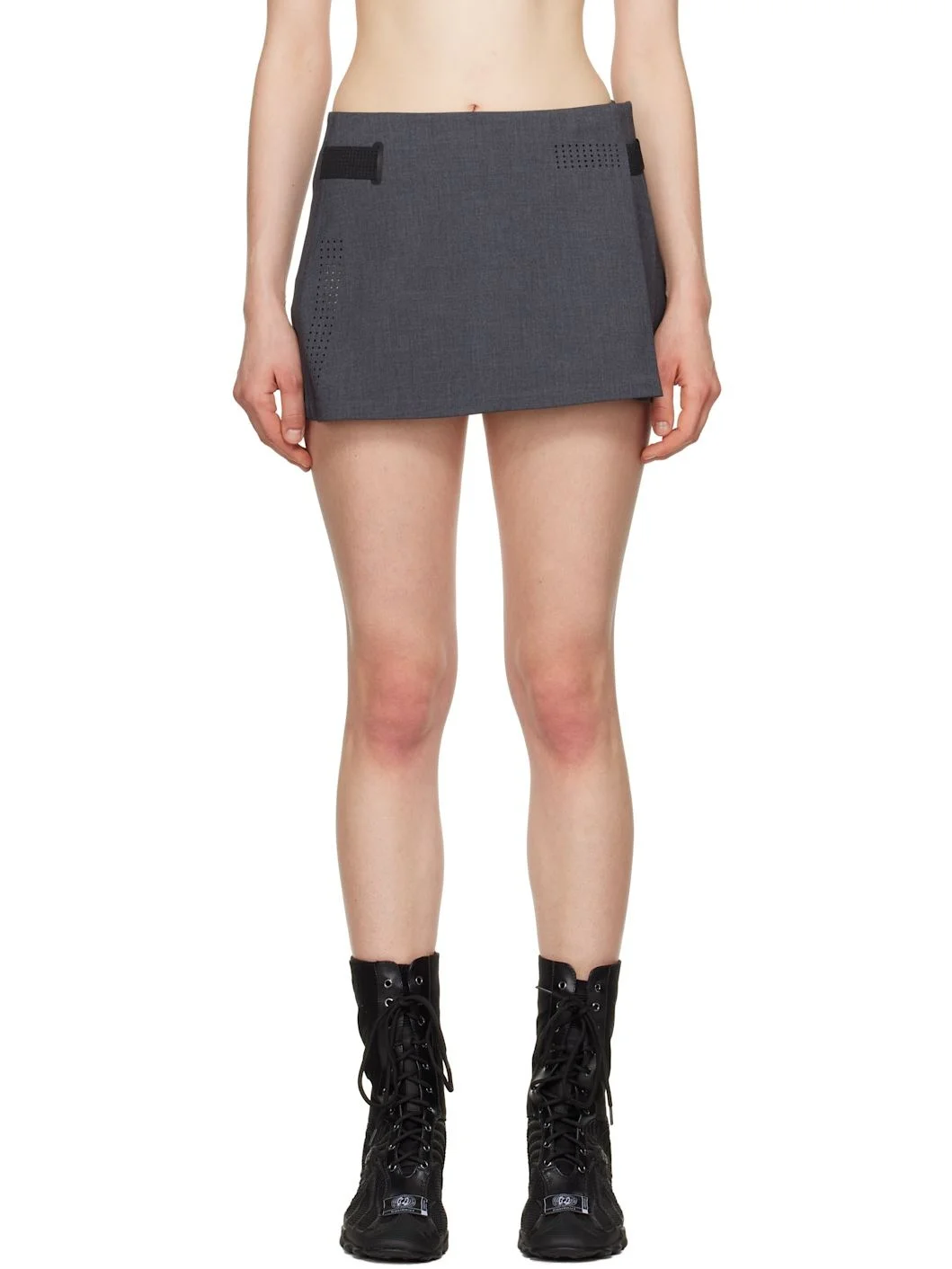 Plain-woven stretch polyester-blend miniskirt. Laser-cut perforations throughout. · Wrap construction · Pleats at front · Elasticized belt-style straps at sides Supplier color: Dark grey 64% polyester, 32% rayon, 4% polyurethane. Made in South Korea 251429F090001