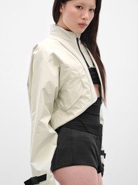 In a futuristic pale green, this Hyein Seo jacket offers a versatile, two-piece design crafted from a technical fabric. The bolero overlay features innovative technical detailing for a striking, avant-garde finish. Featuring: • Relaxed fit • Two-piece design with a bolero overlay and a sleeveless underlay • Bolero overlay features integrated sleeves and pockets • Sleeveless underlay has a stand collar and zip closure • Adjustable strap detailing throughout • Made in South Korea • Main: 100% Nylon | Secondary: 84% Nylon 16% Spandex • Numeric sizing Model is 5'7" wearing size 1. Bust: 30" Waist: 24" Hips: 35"
