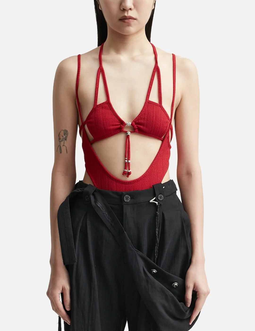 - Hyein Seo - Layered Swimsuit - Two-piece style - Ribbed knit construction - Multiple shoulder straps - Keyhole design at the centre - Brass charm details - Tie closure - Color: Red - Material: 96% Polyester, 4% Spandex - See more Swimwear and Clothing SIZING - Model wears size 0 - Model measures: Height 170cm, Chest 29”/75cm, Waist 22”/57cm,Hip 33”/86cm