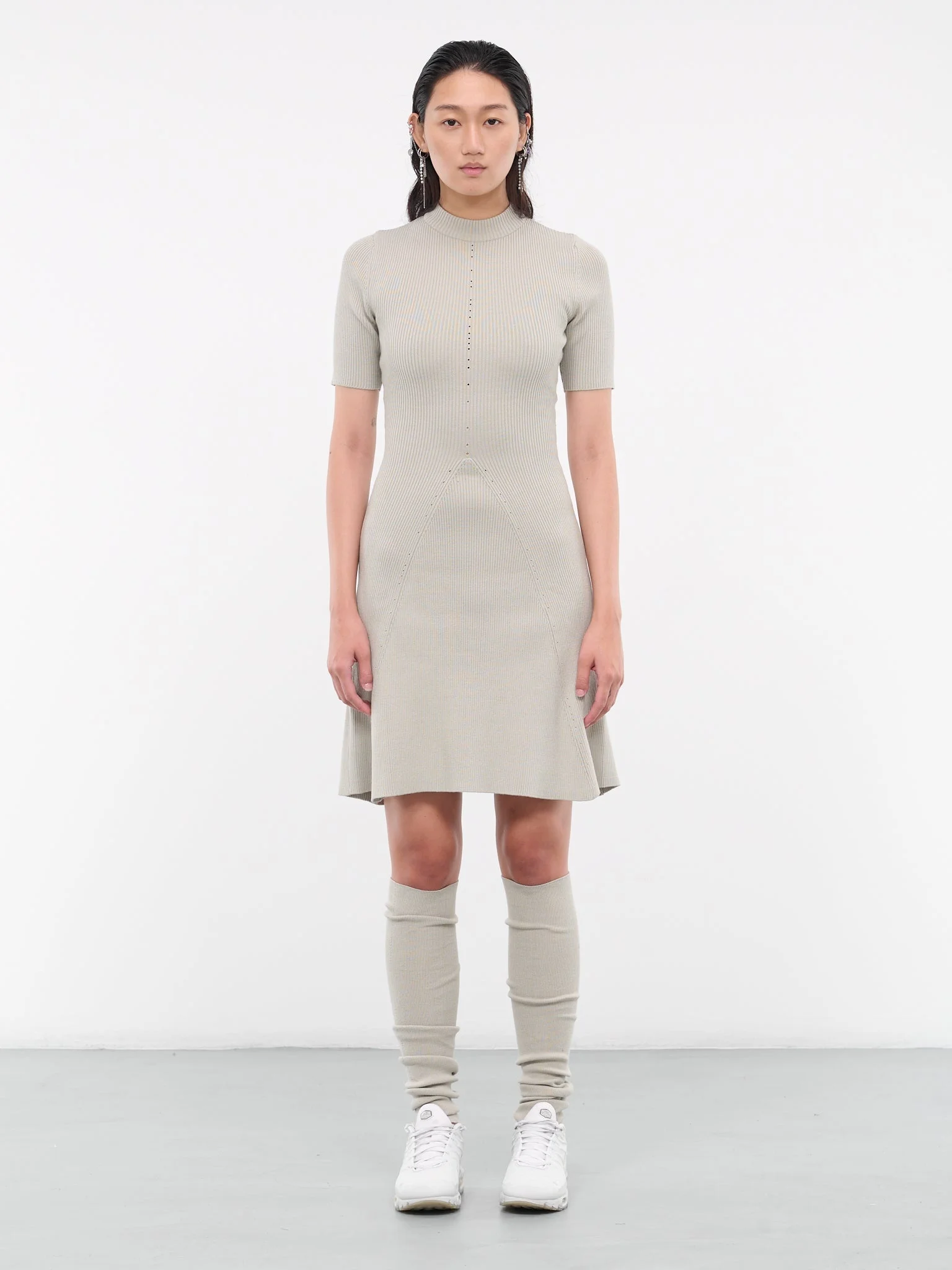 DI PETSA beige dress, paneled construction, rib knit, dot cut-outs, mock neck, short sleeves, slight flared hem, mini length, semi-fitted. Numeric Sizing Model is 5'10" wearing size 1. Bust: 31" Waist: 23.5" Hips: 35"