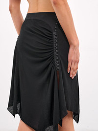 HYEIN SEO skirt in black, paneled knit construction, rib-knit, all-over shirring & ruching, high waist, side logo patch, side cut-out, front & back button closure, leg slits, side ruffling & draping, asymmetric hem, midi-length, slim fit. Made in South Korea Material 1: 80% Polyester 20% Wool Material 2: 60% Nylon 40% Cotton Material 3: 100% Polyester Numeric Sizing Model is 5'8" wearing size 1. Bust: 32.5" Waist: 24" Hips: 34"
