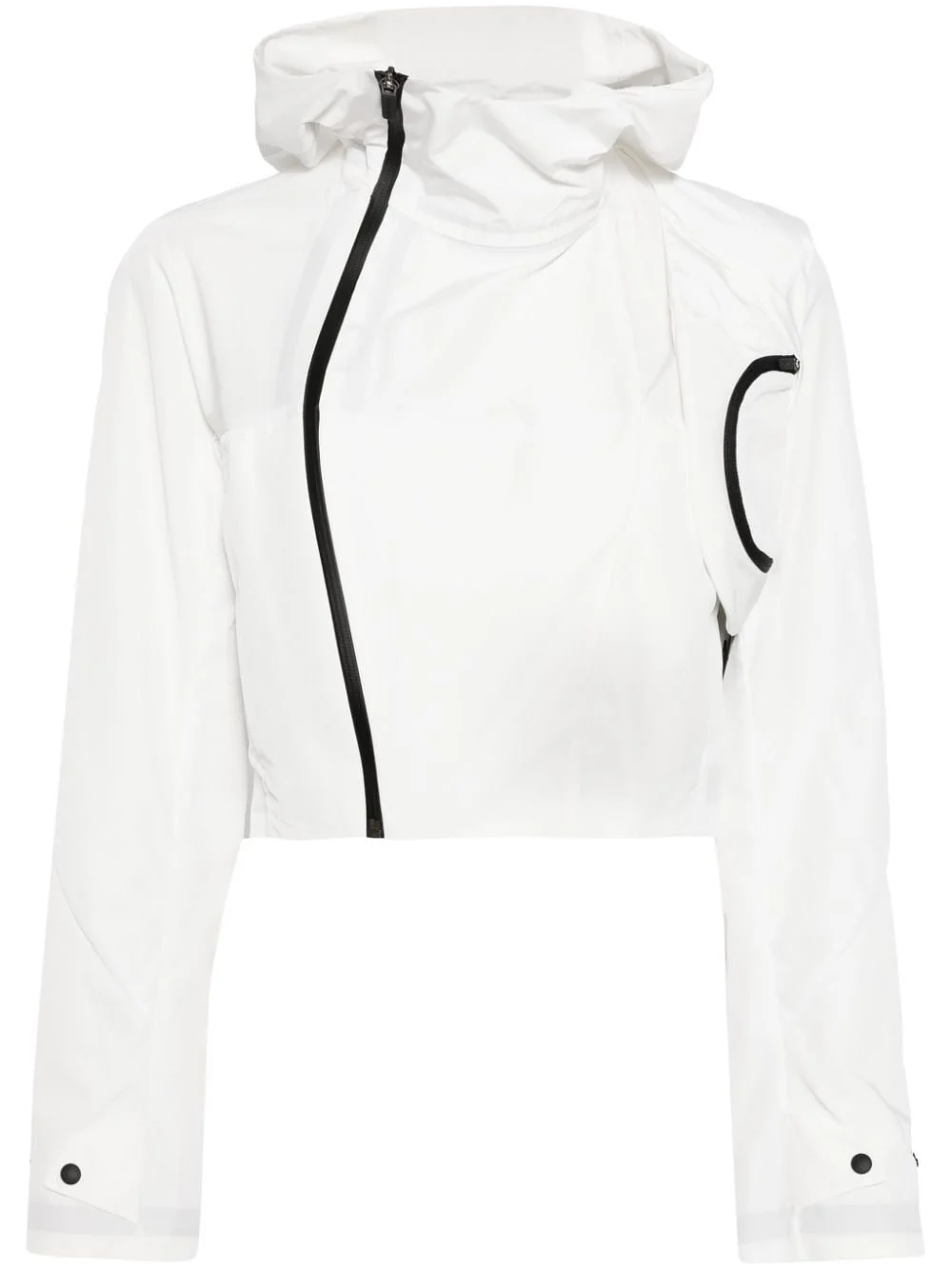hooded cropped shell jacket Highlights - White - Shell - Contrasting trim - High neck - Classic hood - Long sleeves - Off-centre front zip fastening - Multiple zip-fastening pockets - Straight hem - Cropped Imported Composition Outer: Polyester 100%