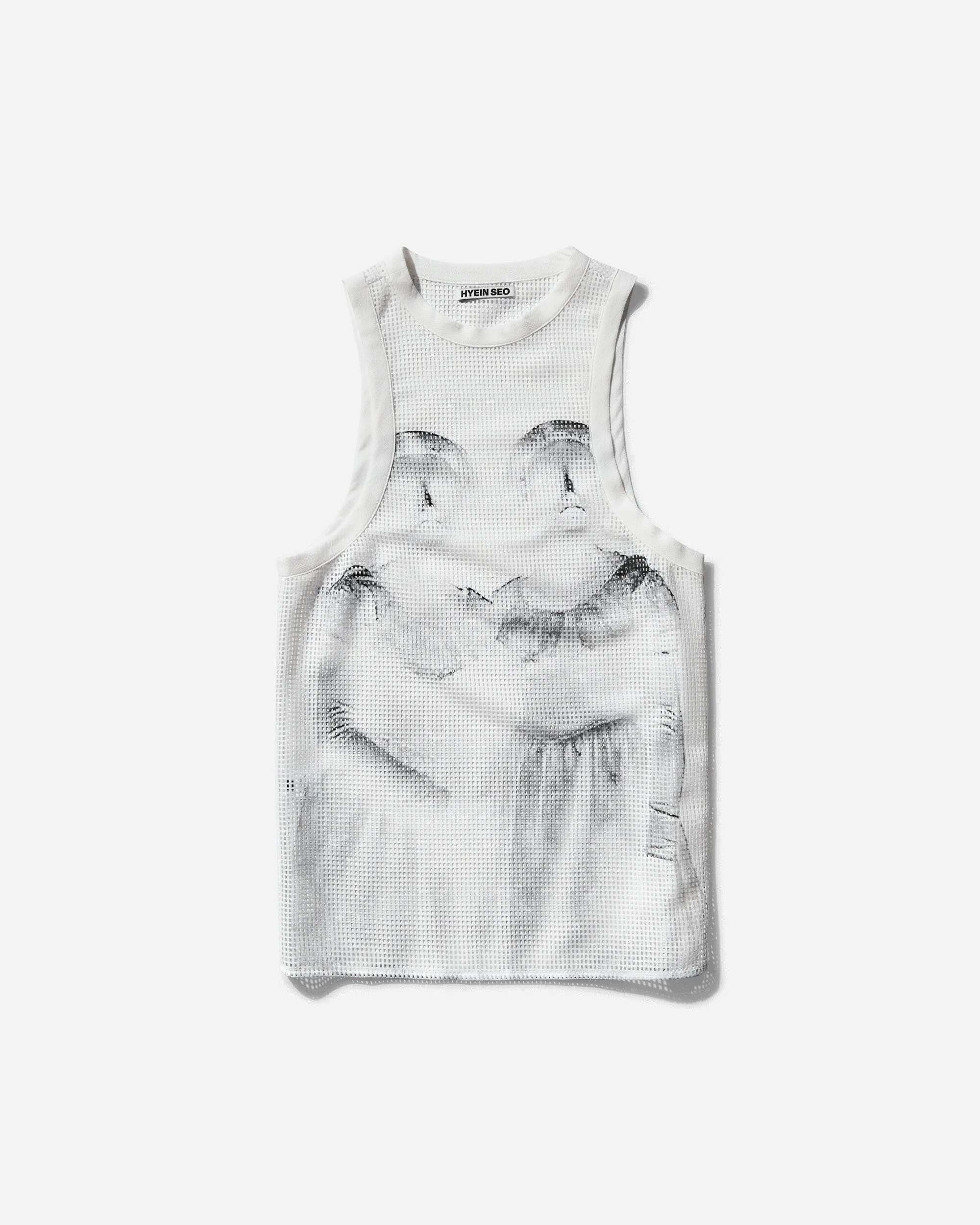 HYEIN SEO "JR" Mesh Sleeveless Top White Oversized tank top in mesh fabric featuring an image created by artist Jon Rafman, printed digitally and one side seam can be opened using snap buttons. - 100% Polyester - Mesh Fabric - Oversized Fit - Jon Rafman Artwork - Snap-Button Opening - Made in South Korea - Style Code: SS25TS7W 2