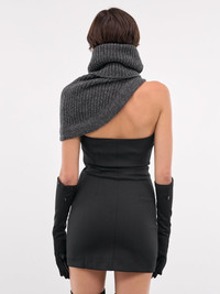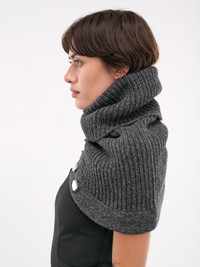 HYEIN SEO scarf in dark grey, wool-nylon blend, paneled knit construction, rib-knit, turtleneck, button detailing, off-shoulder, fitted. 60% Fine Wool 30% Nylon 5% Acrylic 5% Rayon One Size